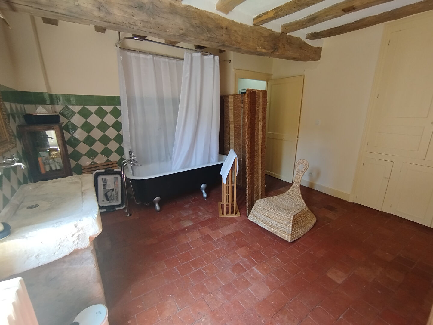 A l'étage : un escalier de meunier mène à un palier distribuant une seconde chambre, une salle d'eau avec WC, ainsi qu'un grenier offrant un potentiel d'aménagement supplémentaire.