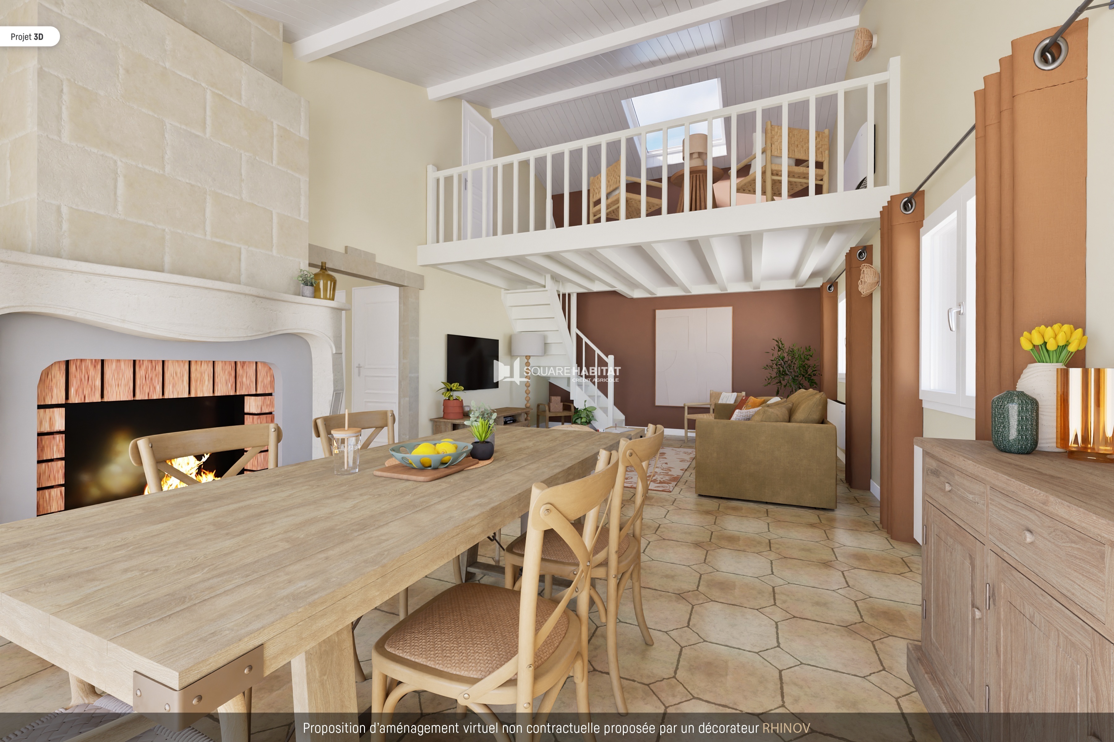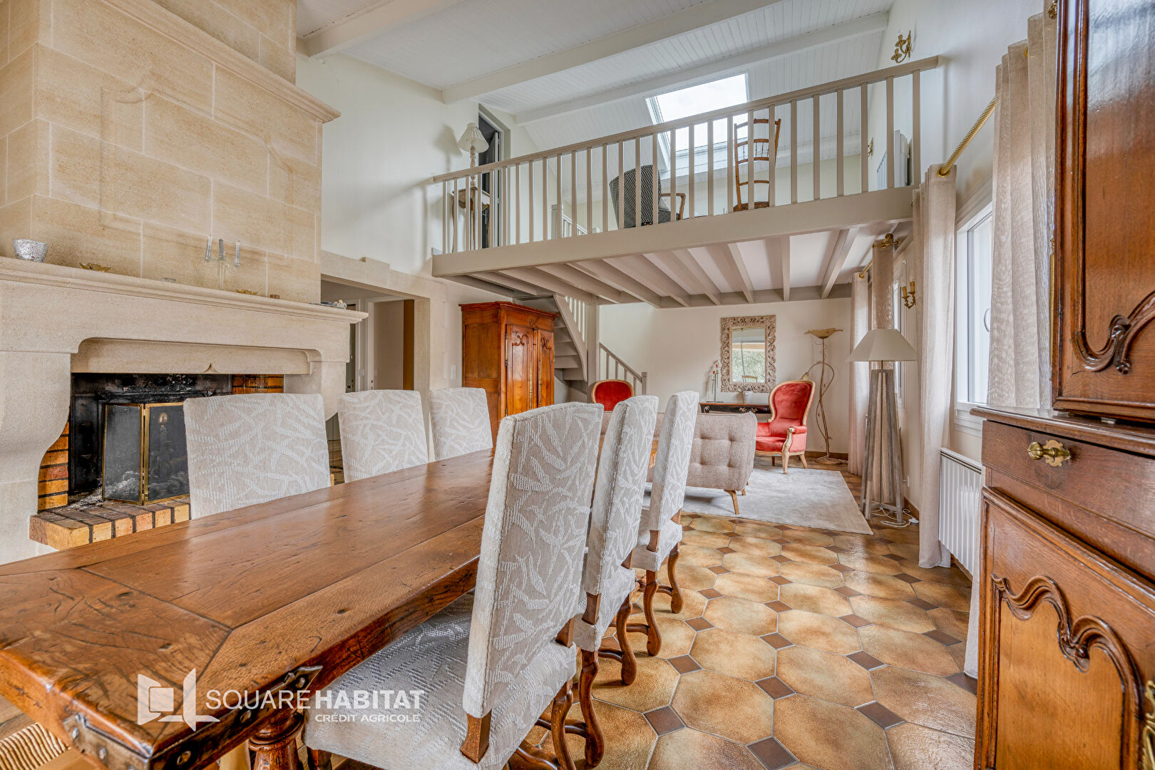 Maison composée d'une entrée desservant un salon-salle à manger lumineux avec une belle hauteur sous plafond. Une cuisine dinatoire spacieuse, équipée et lumineuse. Trois chambres de plain-pied, deux salles de bains. À l'étage, une mezzanine et une grande chambre.