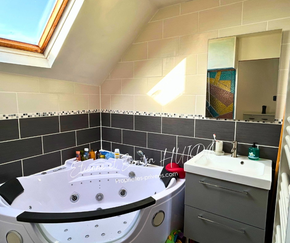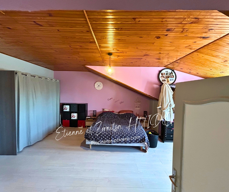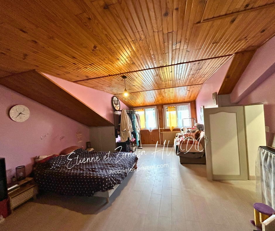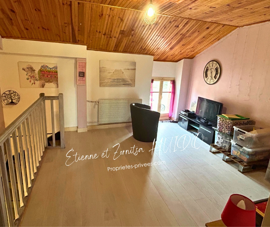 A l'étage, on y trouve un grand palier, une chambre et une autre pièce qui n'est pas chauffé (à finir de rénover), une salle de bain et des WC.