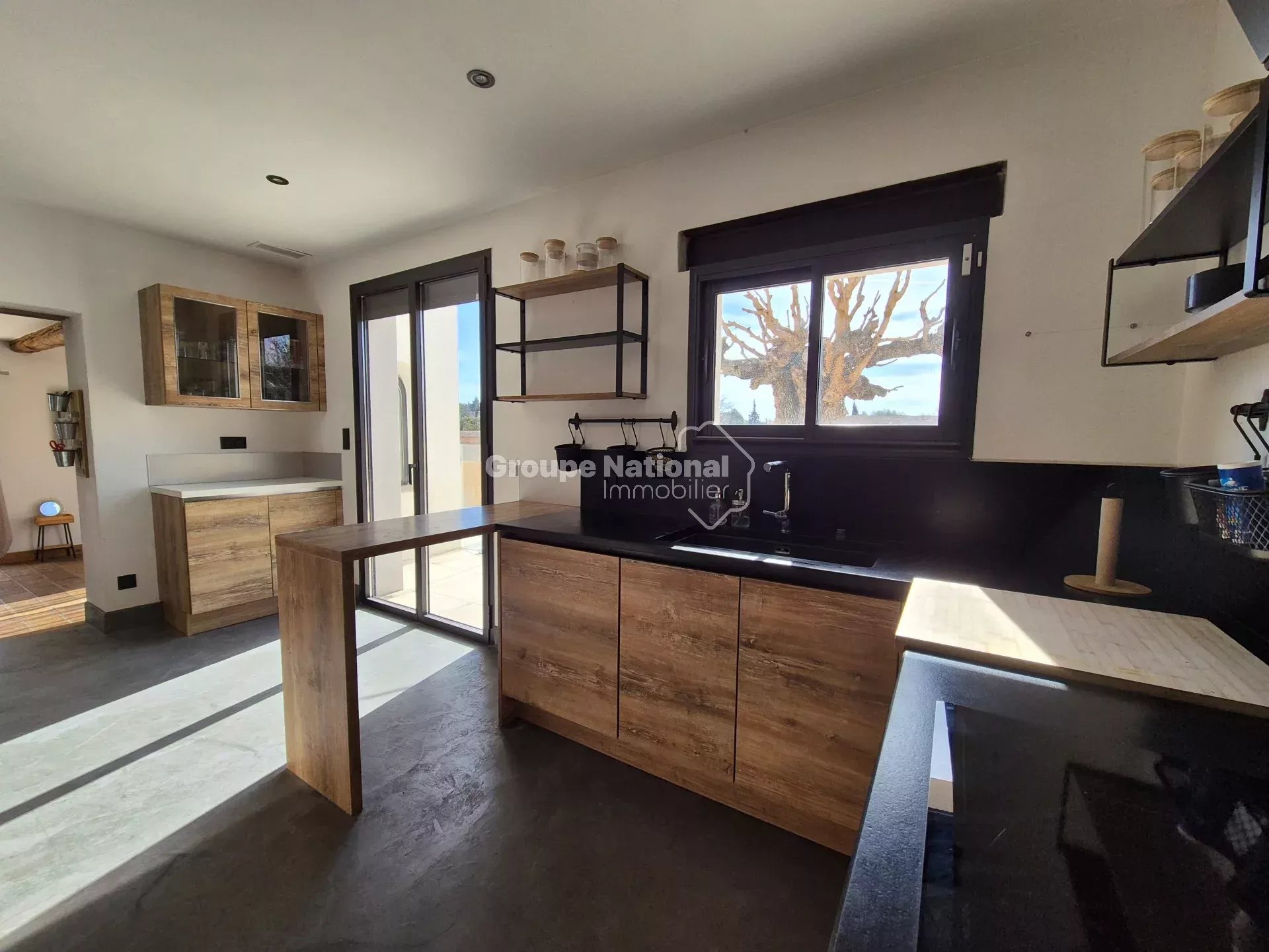 Une cuisine de 14 m² équipée aménagée donnant sur une terrasse carrelée au sud de la maison.