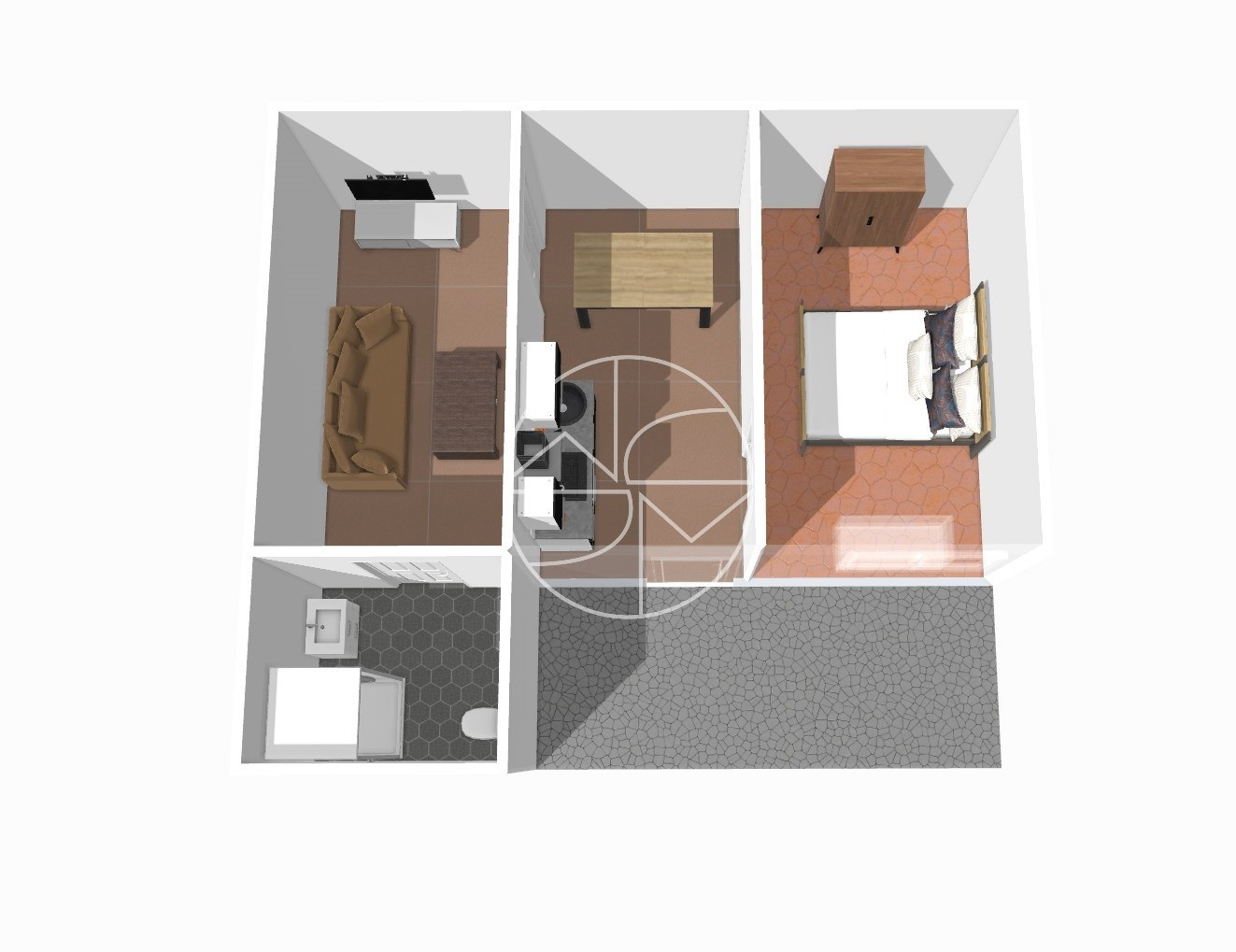 Au premier niveau, côté cour, un appartement de deux pièces avec cour privative avec rangement, comprenant une entrée, une cuisine américaine, un salon, une chambre et une salle d'eau avec WC.