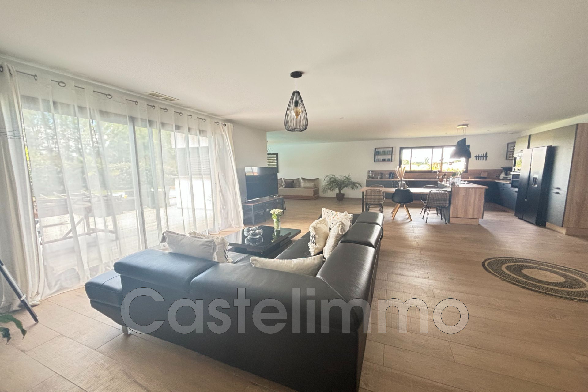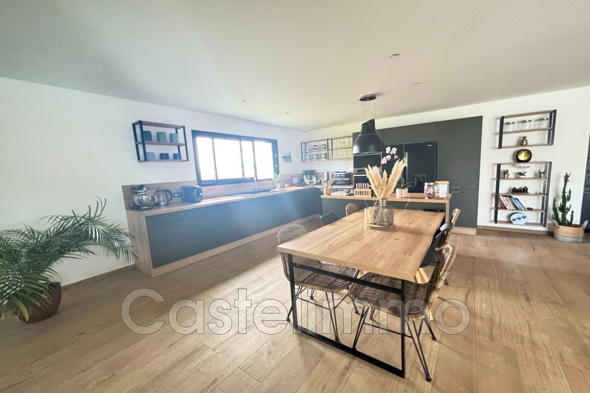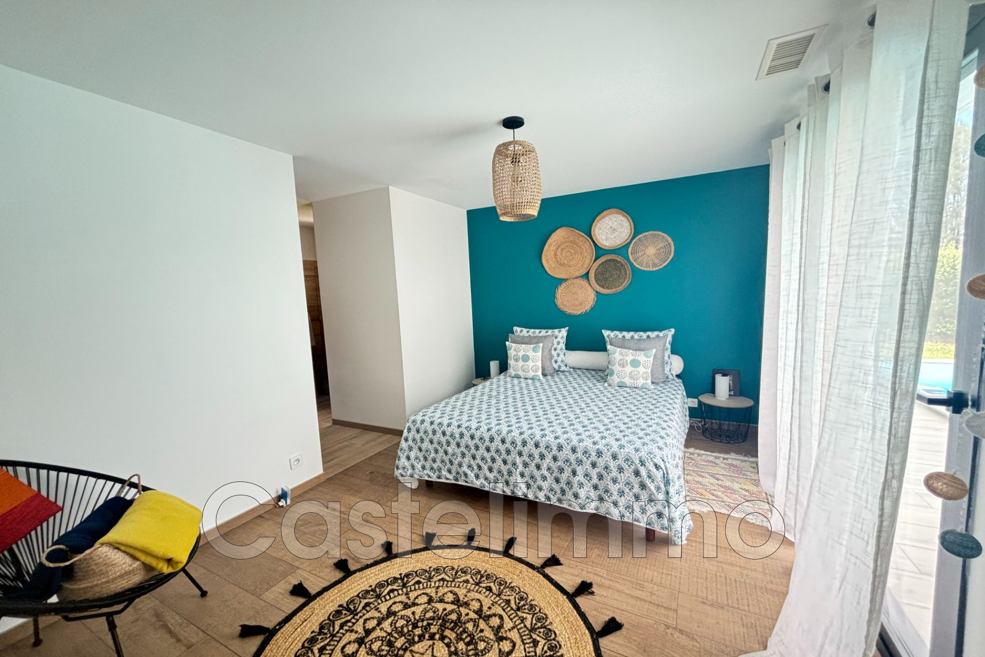 Elle offre un vaste espace de vie lumineux de 68 m² avec cuisine ouverte équipée, donnant directement sur une piscine au sel sans vis-à-vis.