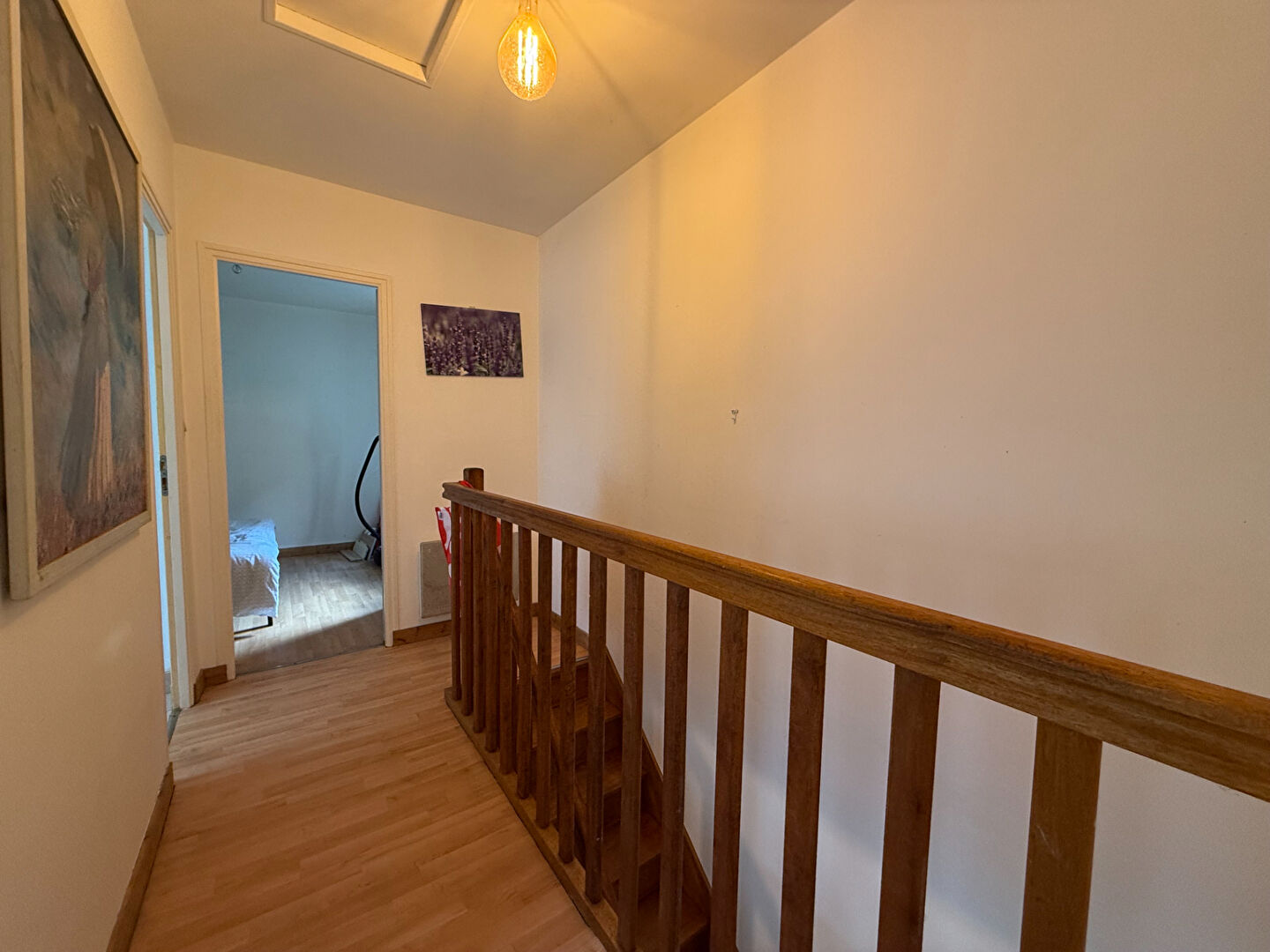 A l'étage, le palier dessert deux chambres lumineuses, une salle de douche, un wc.