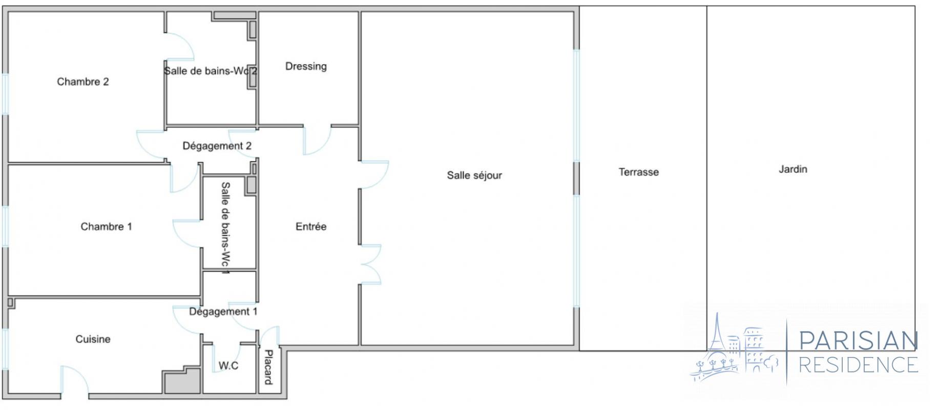 Séjour spacieux de 50 m² avec de grandes baies vitrées, donnant sur un jardin privatif de 93 m² exposé plein sud.