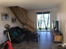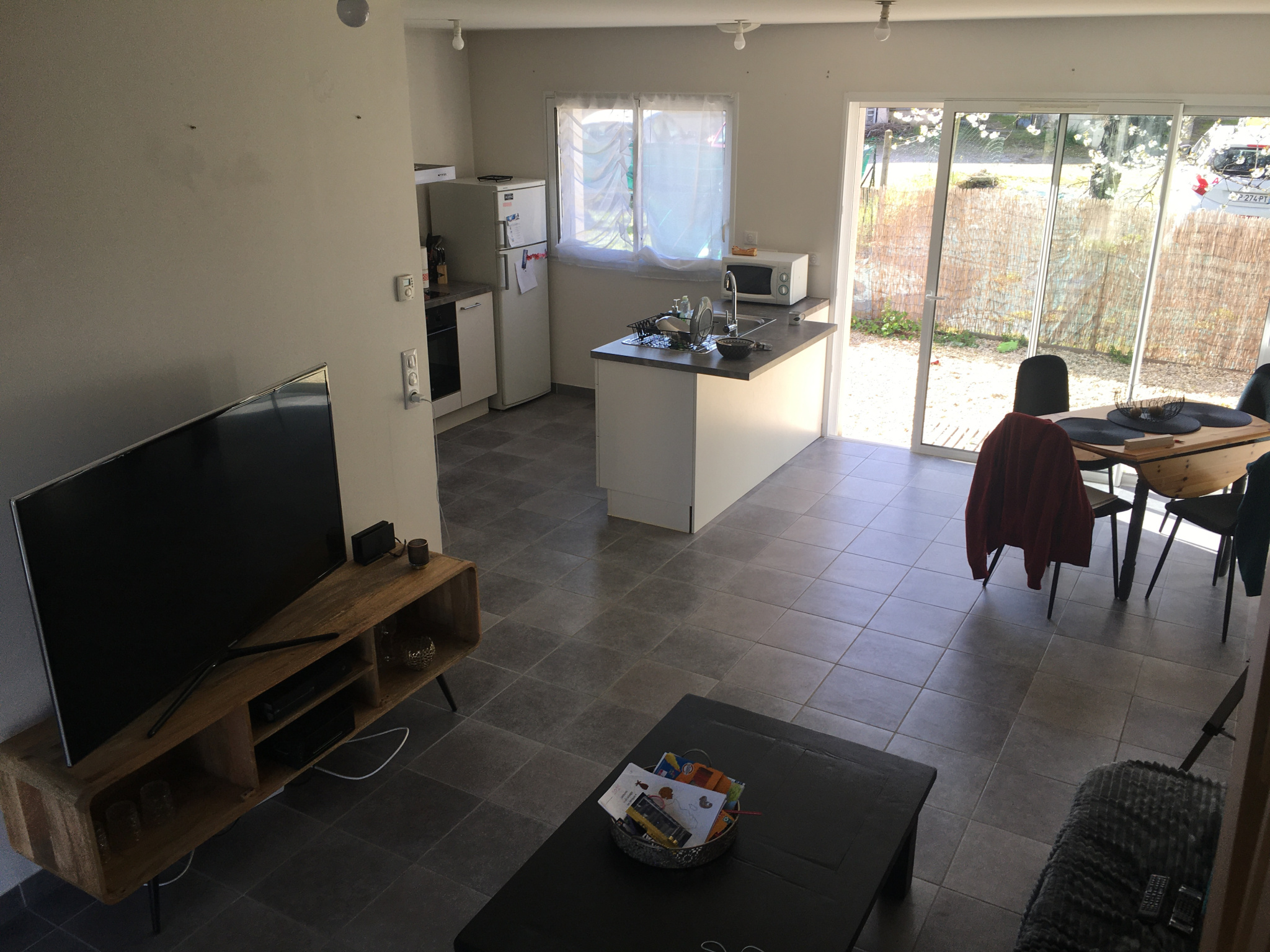 Rez-de-chaussée : cuisine ouverte sur un séjour lumineux avec accès direct à un extérieur privatif.