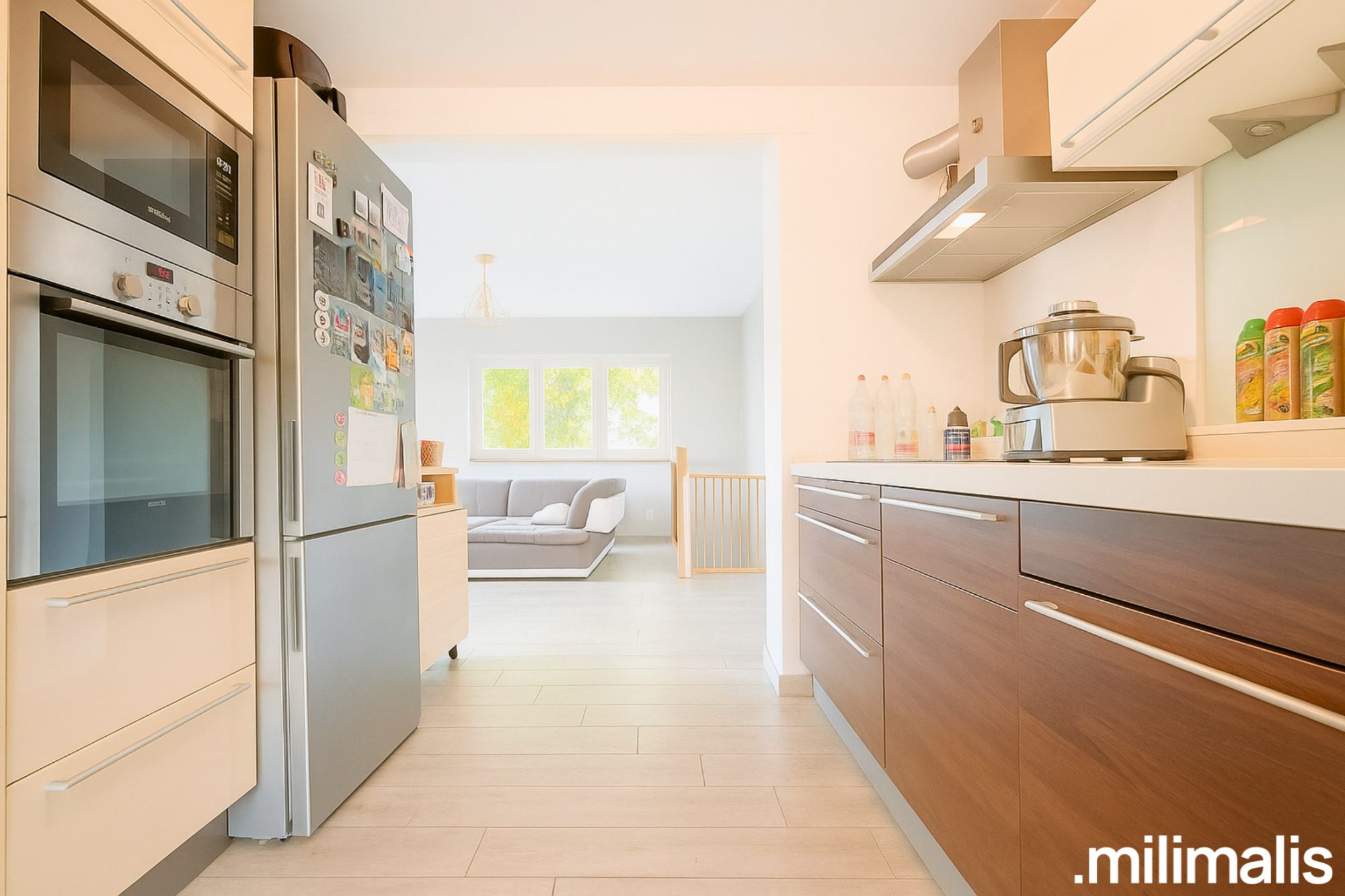 Quelques marches conduisent à l'entrée principale, où l'on découvre tout d'abord une entrée lumineuse. On accède ensuite à la cuisine équipée, qui occupe une position centrale et permet de relier naturellement le premier salon de la maison à l'espace du second salon créé lors de l'extension de 2018. Cette configuration offre une circulation fluide et cohérente entre les différentes pièces de vie. Le second salon, d'environ 30 m², ouvre directement sur une terrasse bien exposée, équipée d'un store ban permettant de profiter des journées ensoleillées tout en conservant le confort intérieur. Un WC indépendant complète ce niveau.