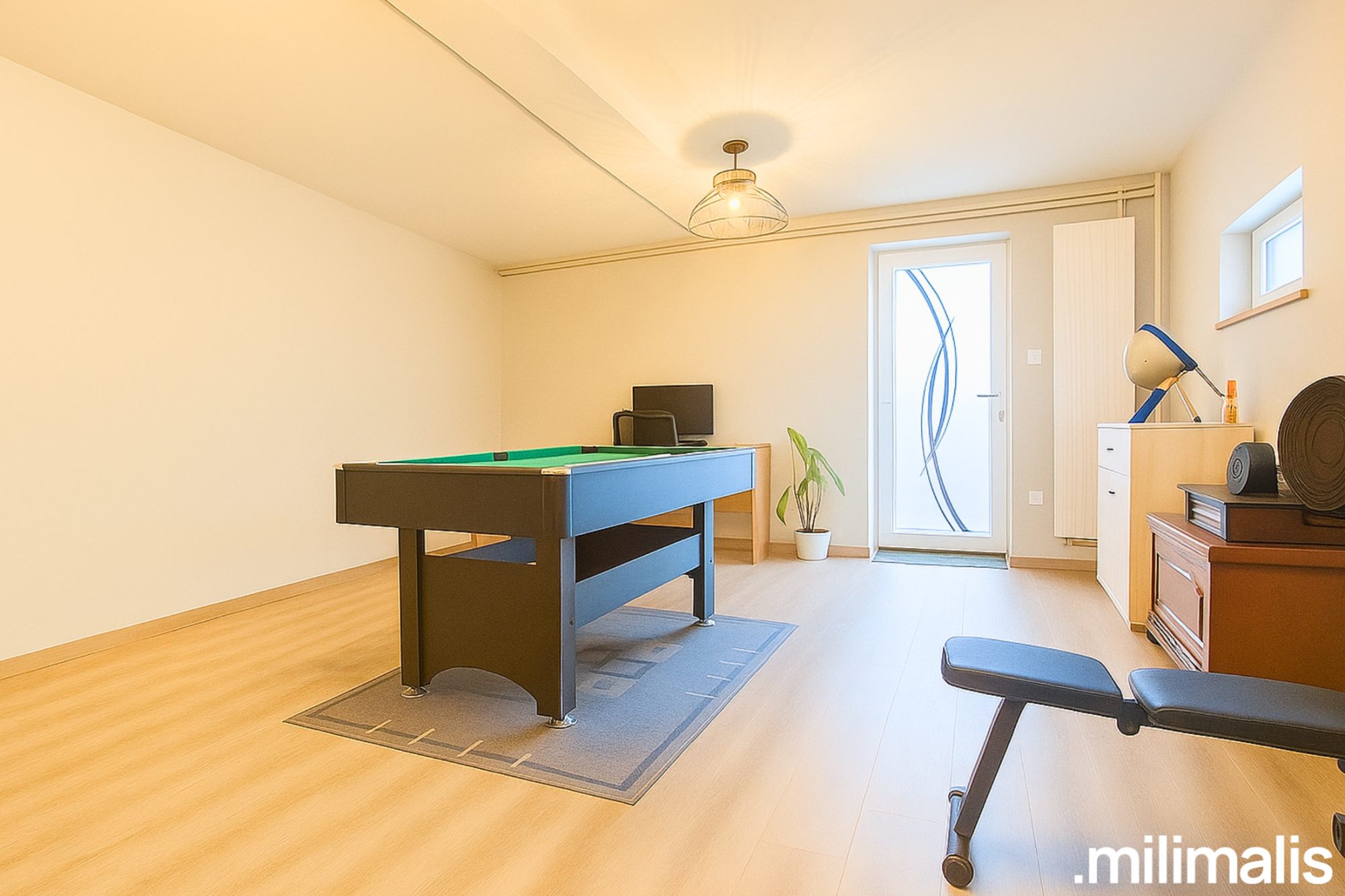 Depuis le second salon, un escalier mène au niveau inférieur, où se trouve une pièce d'environ 30 m², actuellement utilisée en salle de jeux et bureau. Grâce à son accès indépendant, cet espace peut devenir salle de loisirs, studio privé, chambre avec espace détente, salle de cinéma ou convenir parfaitement à une activité professionnelle indépendante, permettant de séparer clairement vie familiale et activité.