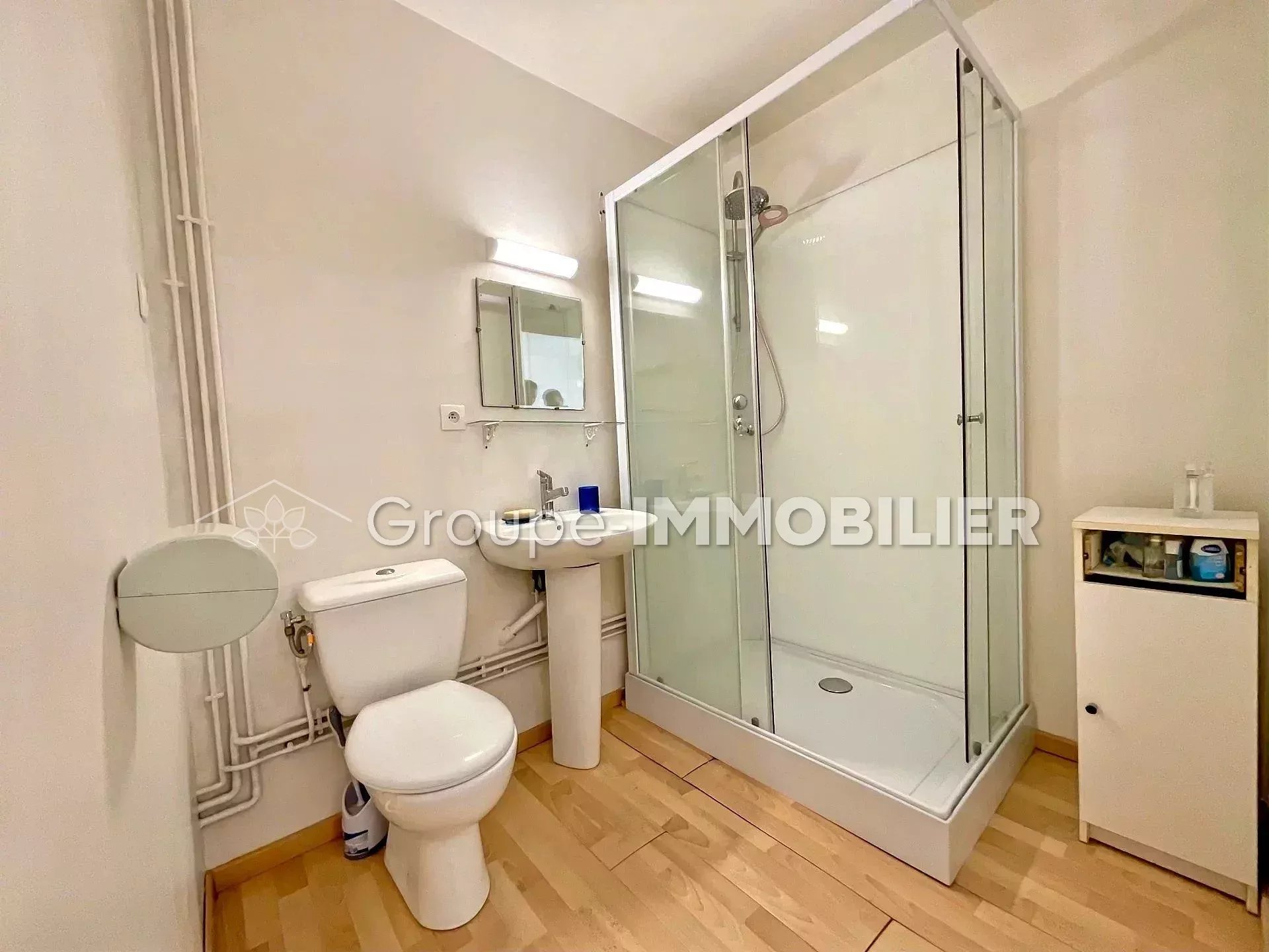 Une grande chambre de 29 m² avec salle de douche et espace bureau.