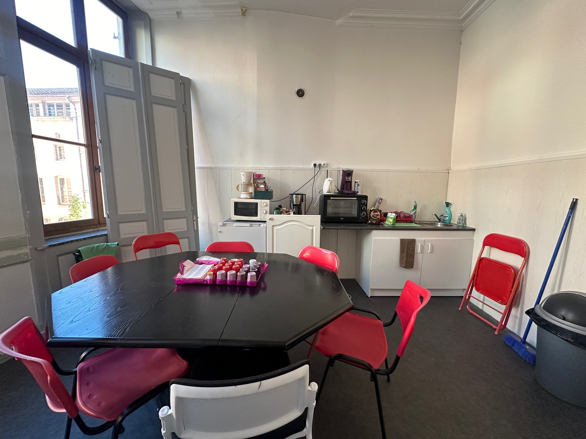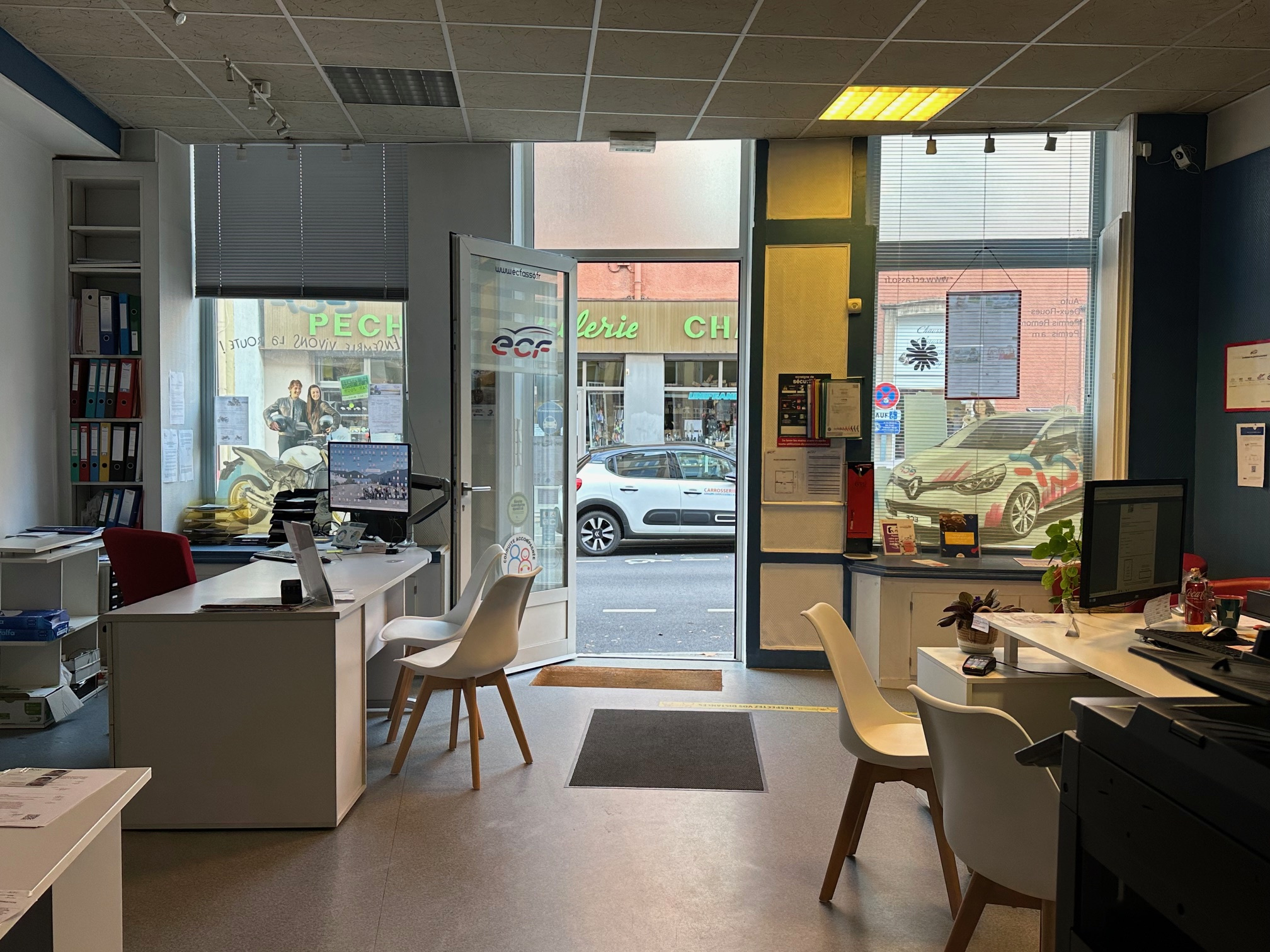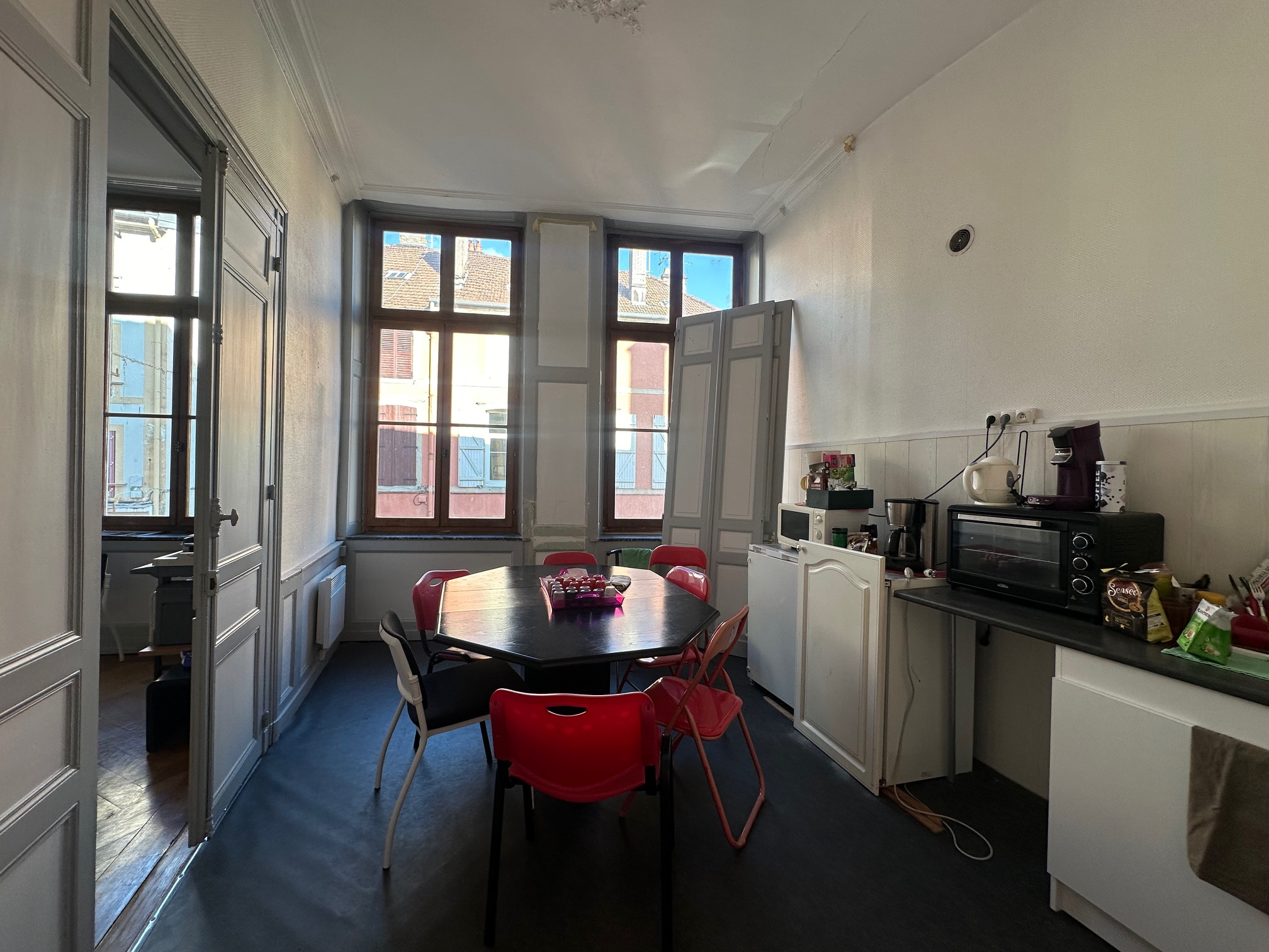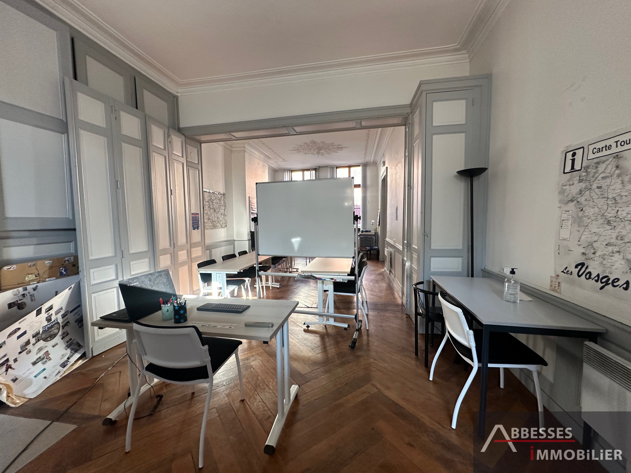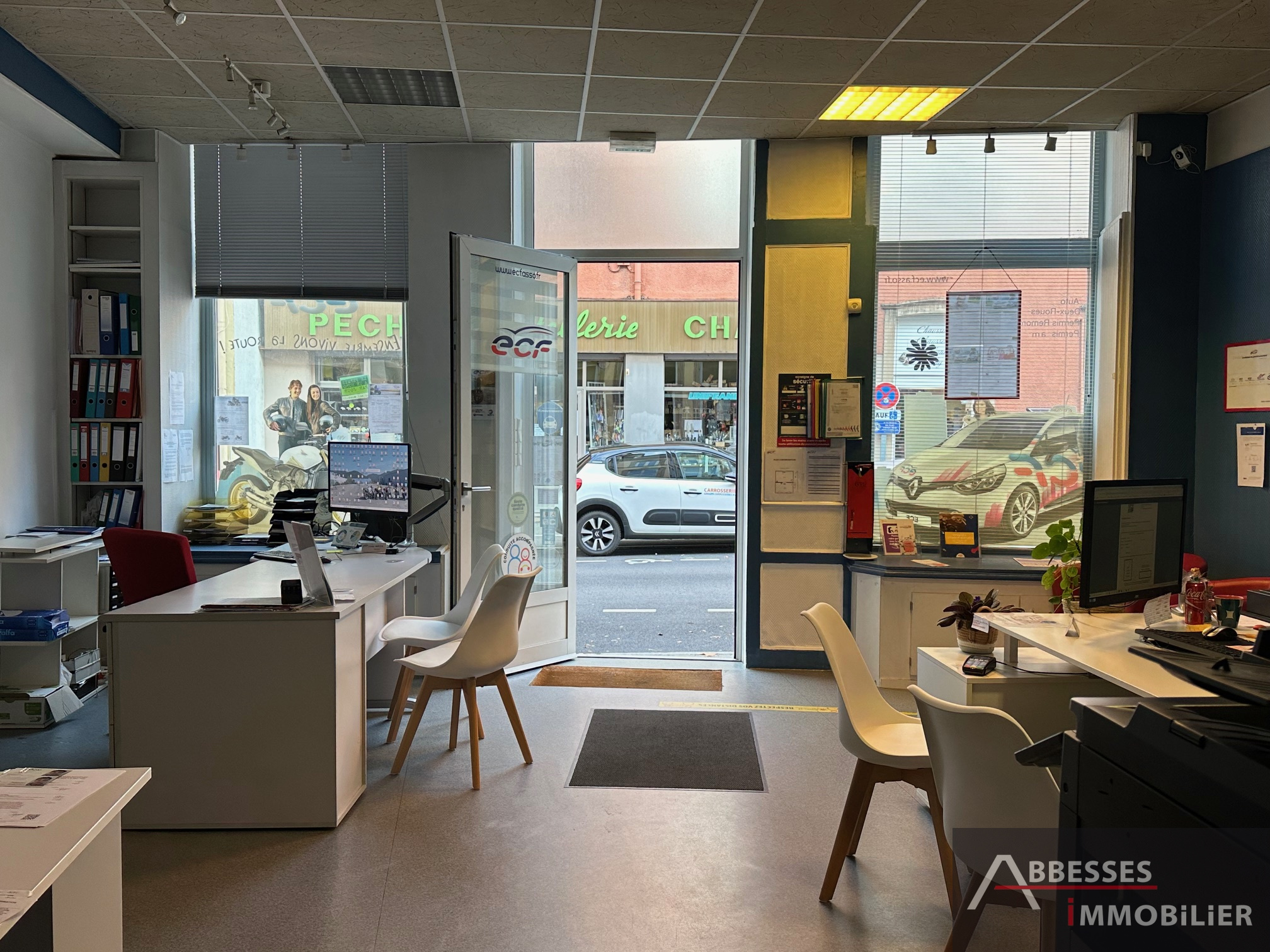 Local commercial (env 62.99 m2 carrez) au rez de chaussé (2 pièces dont une avec vitrine sur rue + sanitaires) + grande pièce bureau à l'étage (env 75.86 m2 carrez) avec partie cuisine et sanitaires.