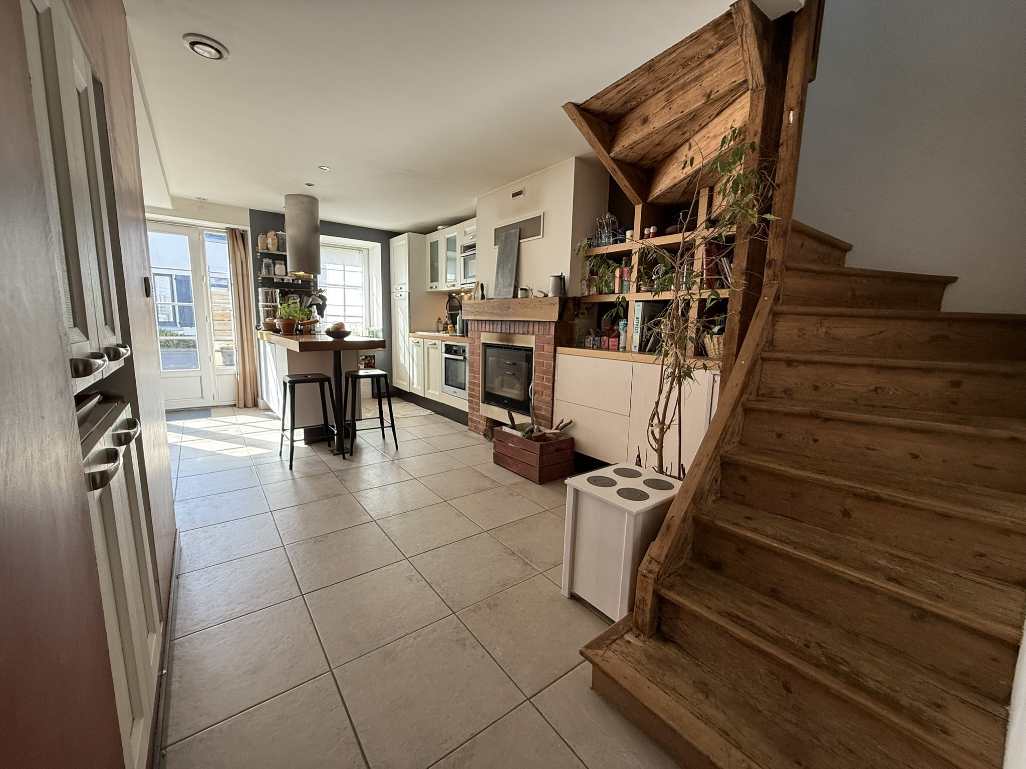 - une entrée desservant un espace de vie (35,50m2), exposition Sud-Ouest, équipé d'une cheminée avec insert (année 2010) et d'un système son home cinéma, donnant sur une terrasse en bois.