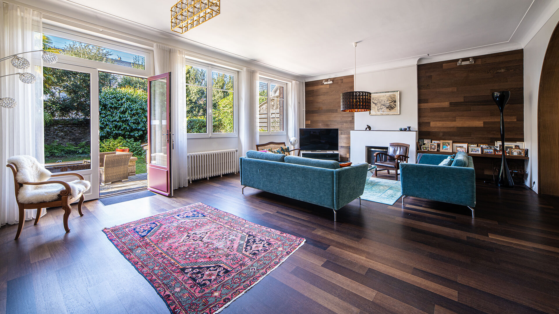 Au rez-de-chaussée, une double entrée avec dégagement mène à un bureau, une vaste réception avec cheminée, une salle à manger ainsi qu'une cuisine avec arrière-cuisine. Un second dégagement dessert un WC indépendant.
