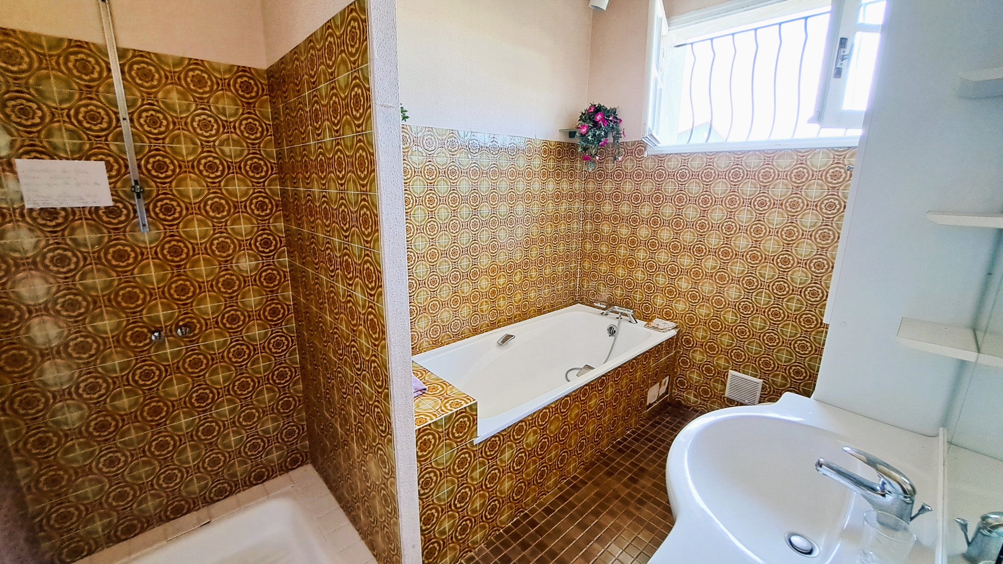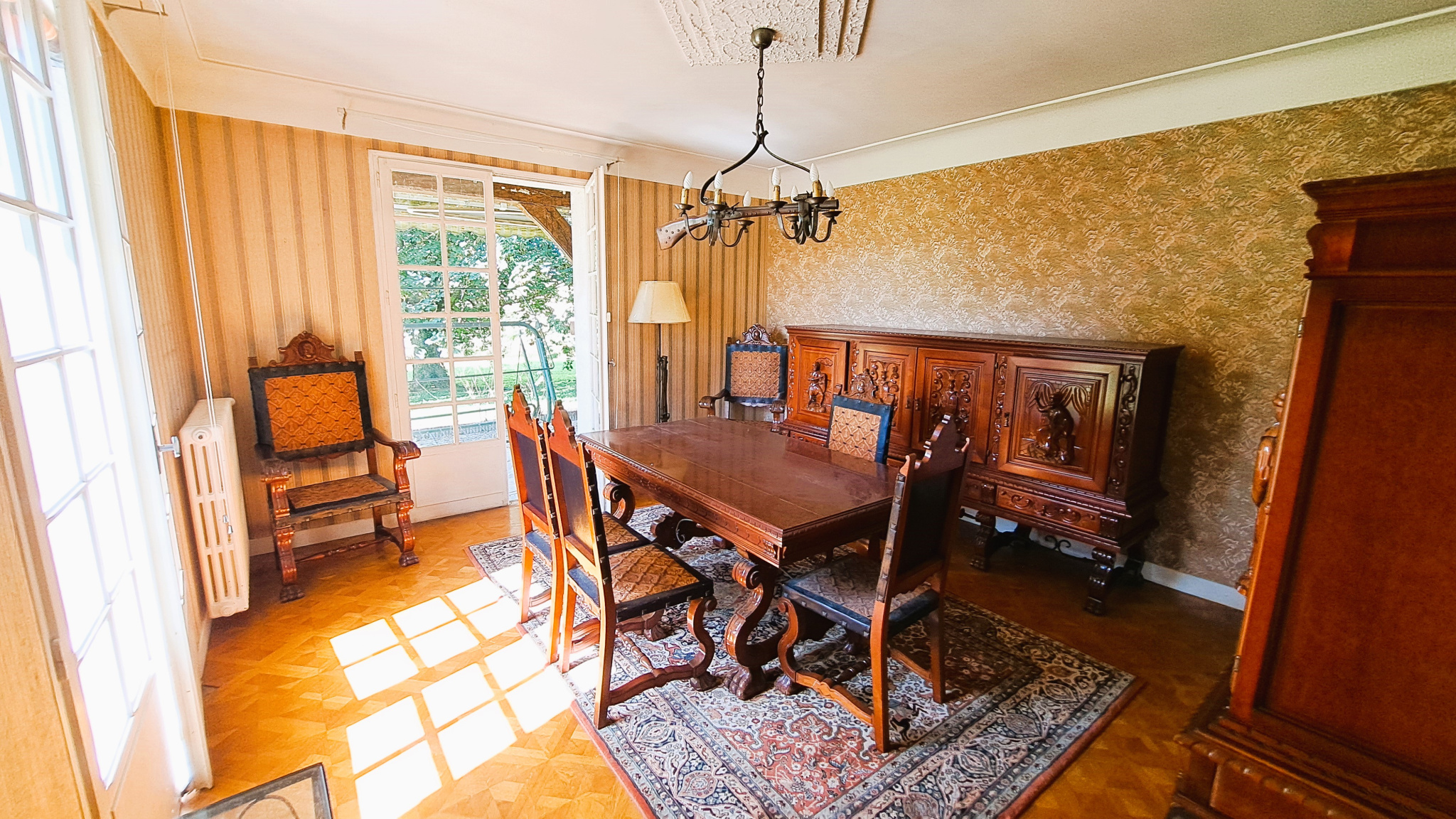 A l'extérieur, sur un grand terrain plat sans vis-à-vis, d'environ 3500 m2 : terrasse et auvent ouvert avec cheminée et stores-bans.