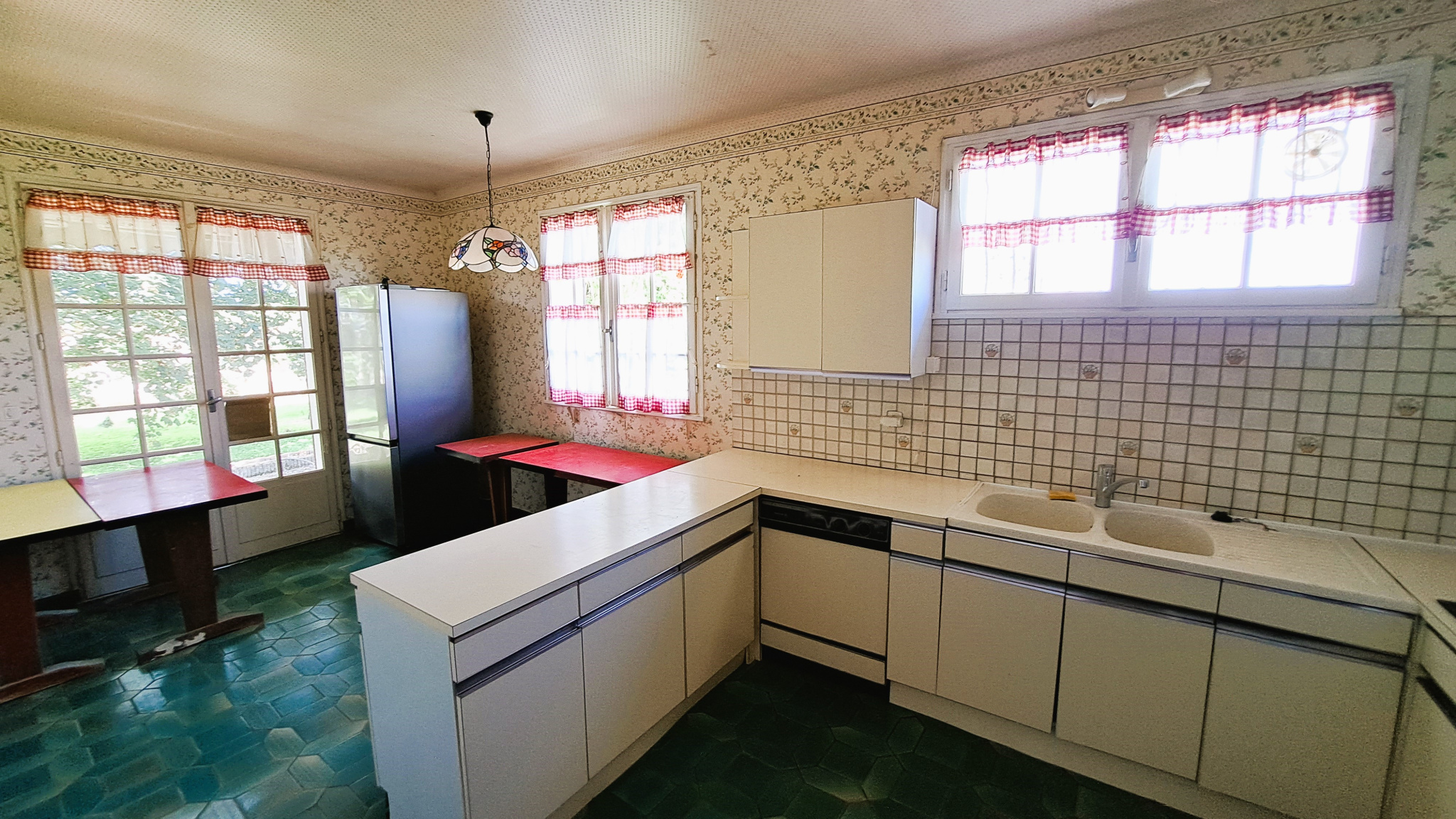 entrée, grande cuisine aménagée de 19 m2, salon avec cheminée-insert et salle à manger de 46 m2, quatre chambres dont une avec salle d'eau et une avec salle de bains (baignoire et douche), deux wc séparés, salle d'eau, débarras.