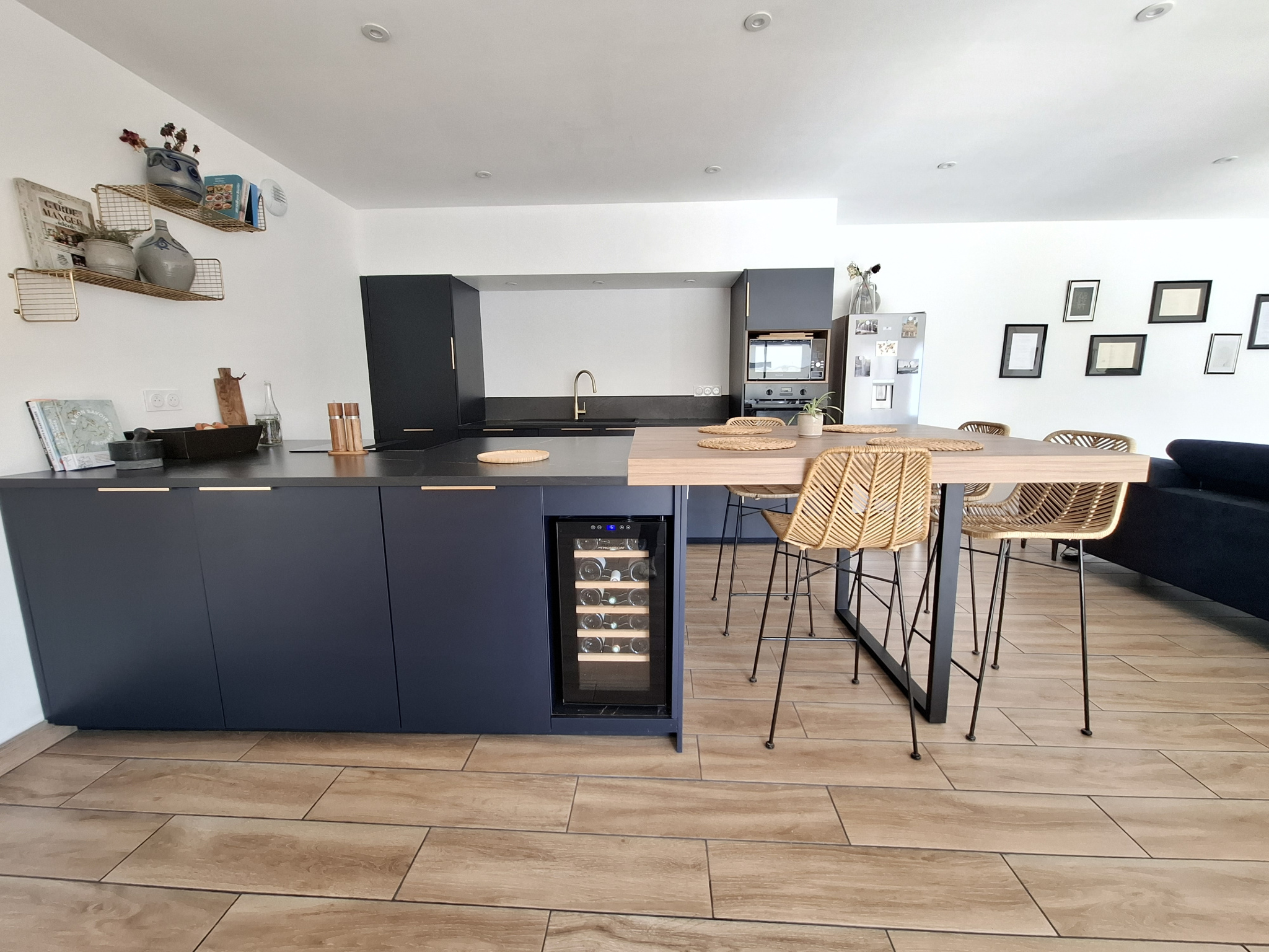 Avec 172 m2 habitables, elle propose au rez-de-chaussée une cuisine américaine entièrement équipée, ouverte sur une vaste et lumineuse pièce de vie avec accès à la terrasse. Un bureau, une buanderie et un WC complètent ce niveau.