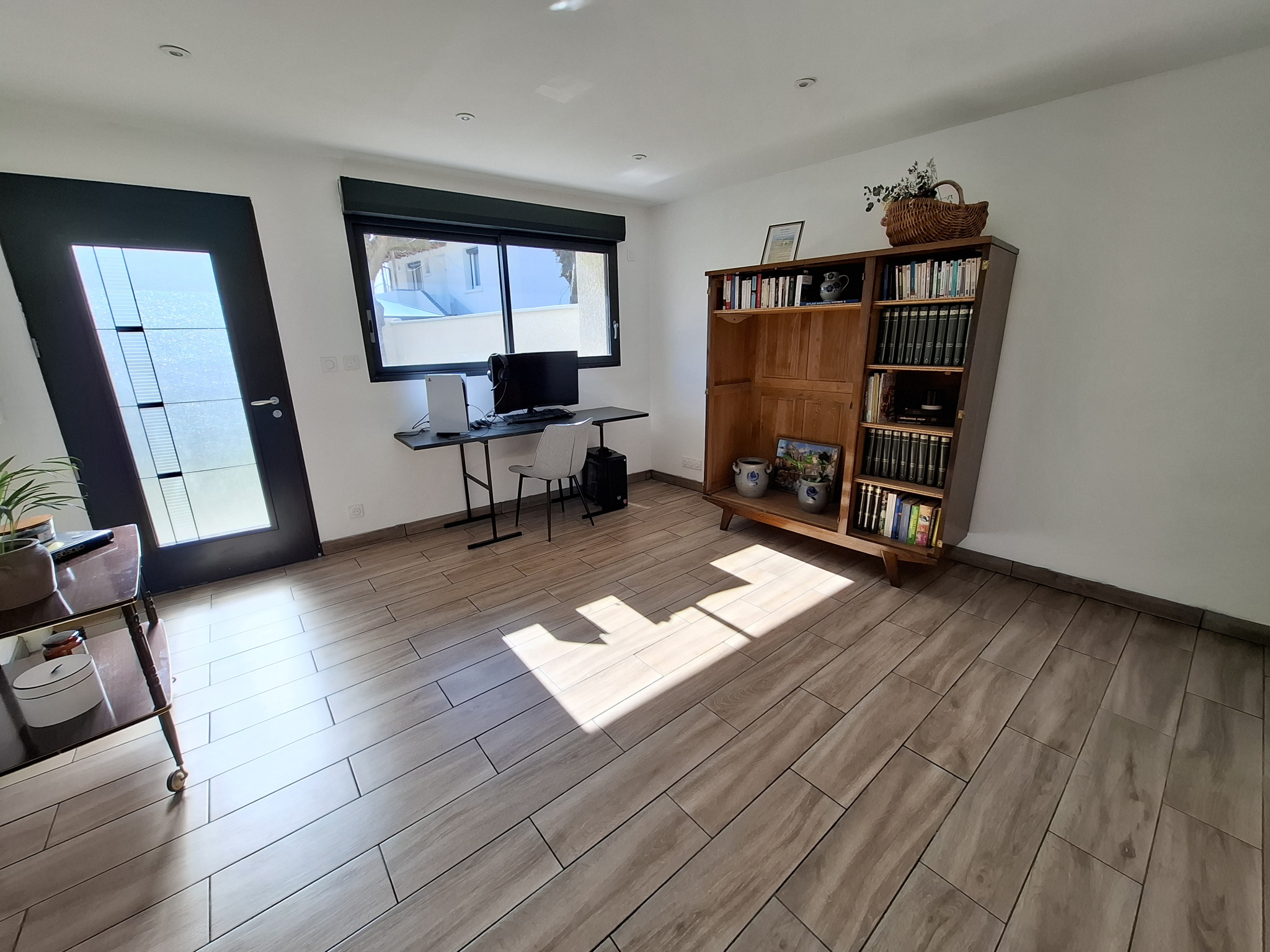 Avec 172 m2 habitables, elle propose au rez-de-chaussée une cuisine américaine entièrement équipée, ouverte sur une vaste et lumineuse pièce de vie avec accès à la terrasse. Un bureau, une buanderie et un WC complètent ce niveau.