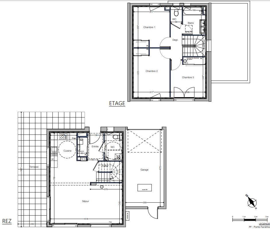 Cette villa de 87.06 m² est composé d'un salon/séjour/cuisine de 34.60m² , un cellier, deux WC, une salle de bains et trois chambres à l'étage.