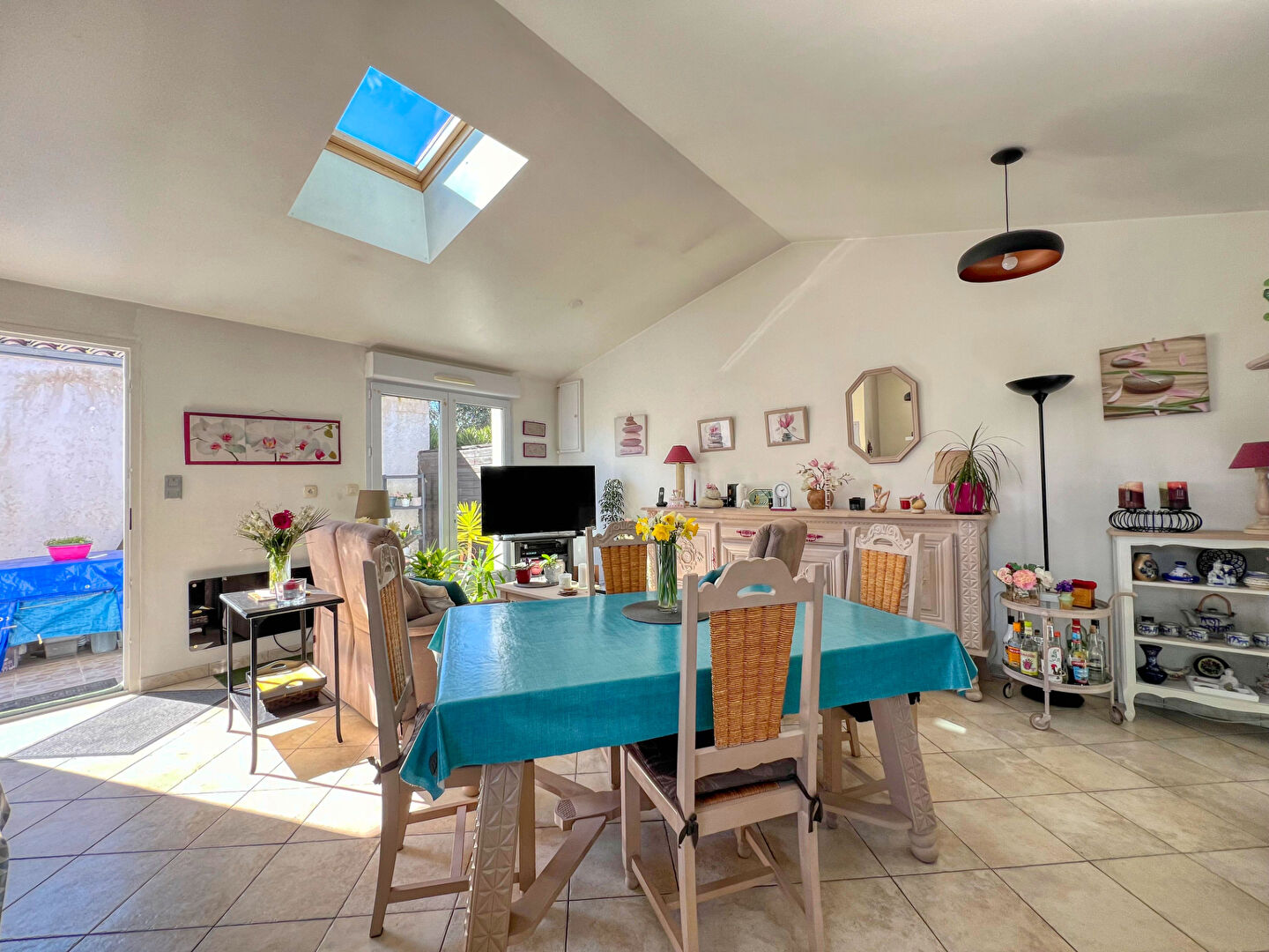 Une vaste pièce de vie lumineuse, dotée d'un séjour cathédrale et d'une cuisine ouverte sur l'extérieur.