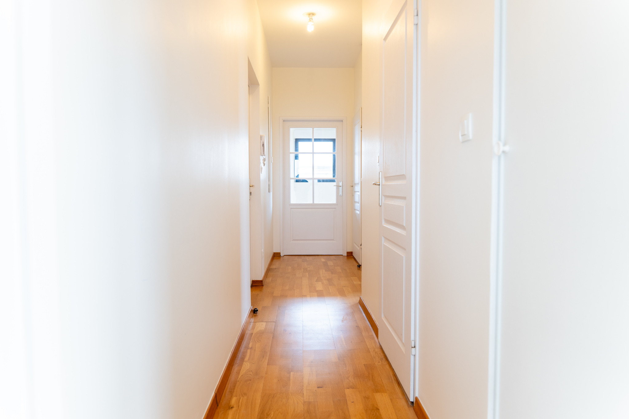 Entrée sur couloir avec placard, séjour-salon sur terrasse d' angle, cuisine ouverte aménagée et semi-équipée orientée Ouest, deux chambres, WC, Salle d'eau.