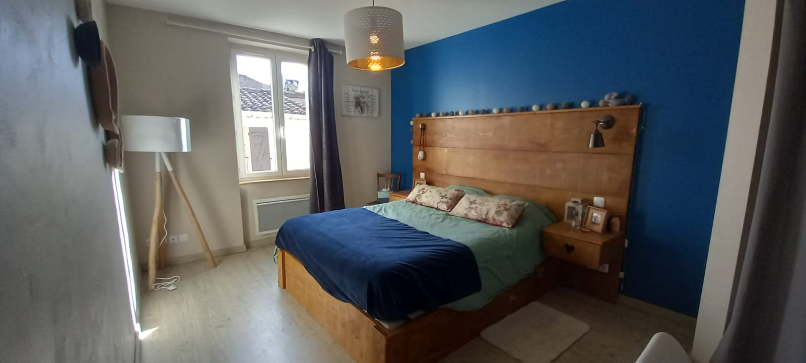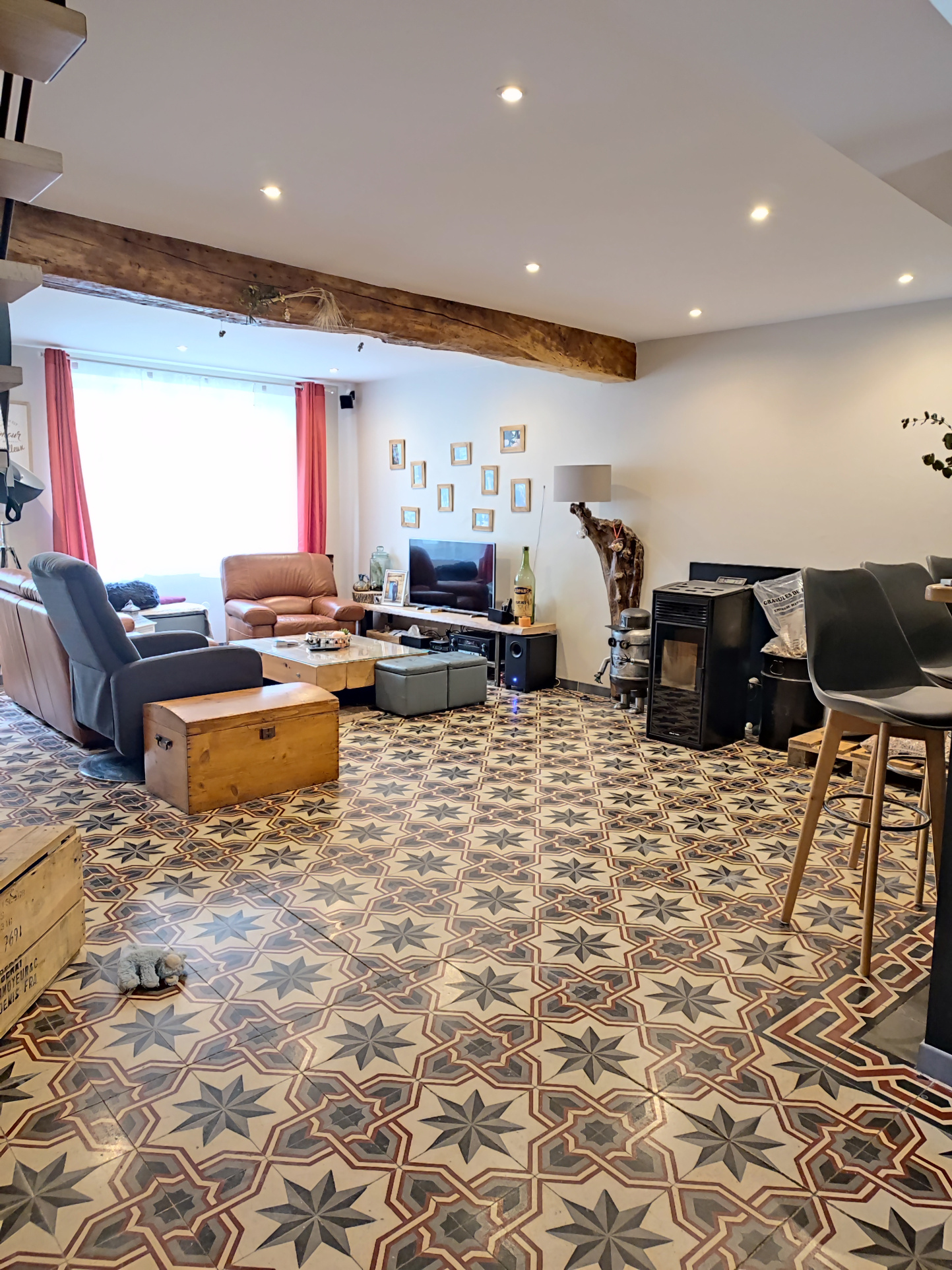 Elle se compose d'une pièce de vie de 74m2 chaleureuse avec ses pierres, ses carreaux de ciment, son poêle à granules, d'une cuisine ouverte et équipée, d'une arrière cuisine et un wc.