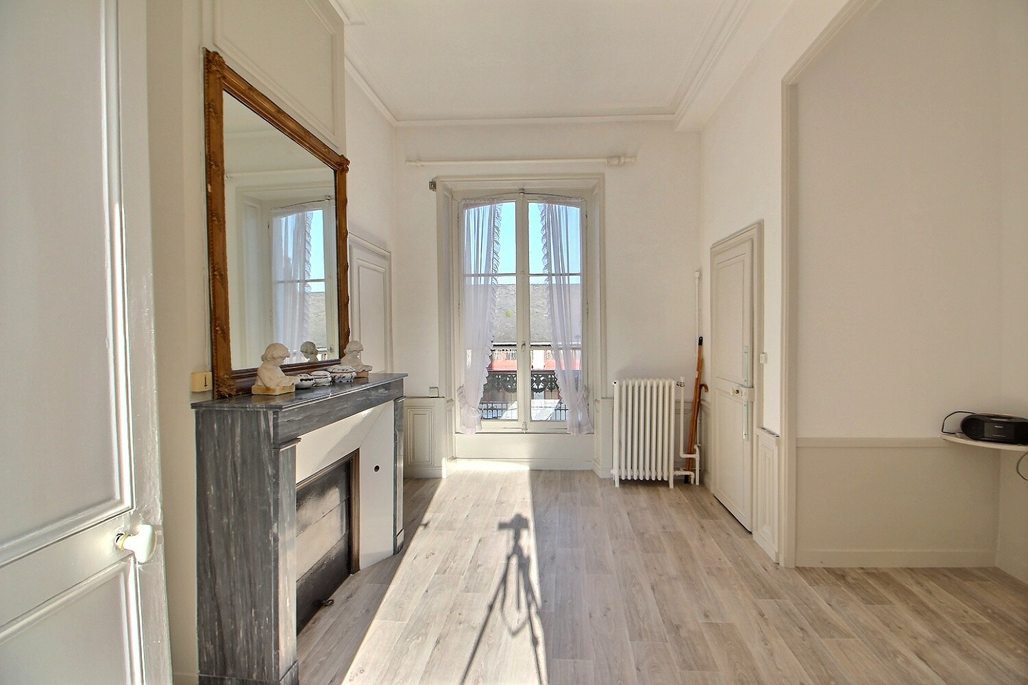 Appartement principal à l'étage : Un espace raffiné avec une entrée élégante, une salle à manger avec cheminée et moulures, une salle de bains, un WC, une cuisine, deux chambres, un salon avec cheminée et alcôve, ainsi qu'un dressing.