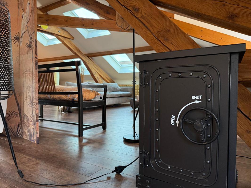 Situé au 4ème et dernier étage d'un immeuble en pierre totalement rénové, cet attique rare offre des volumes spectaculaires, une luminosité exceptionnelle et une vue panoramique à 180° sur la ville et les montagnes du Haut-Bugey.