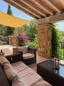 Nichée au coeur de GIGARO et de la pinède, Villa de caractère à fort potentiel, exposée SUD, à proximité de la plage, VUE MER, PISCINE, grandes terrasses, climatisation, Abri voiture.