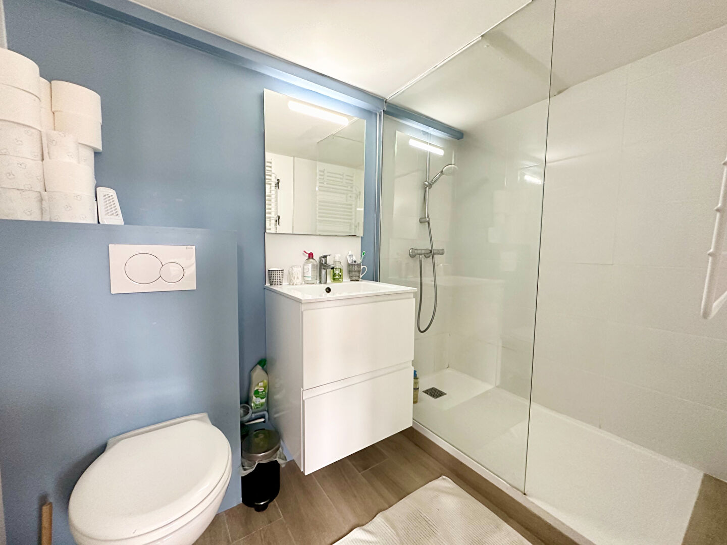Il se compose d'un hall d'entrée offrant une belle pièce de vie très lumineuse, un coin cuisine ouverte ainsi qu'une salle de douche avec vasque et WC.
