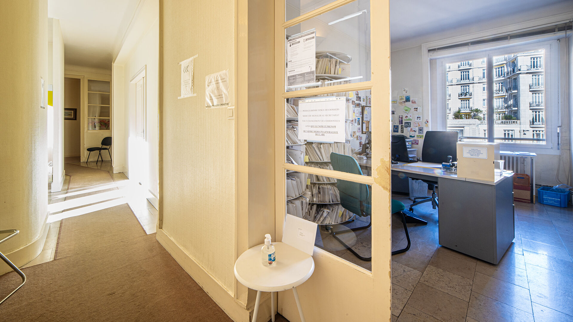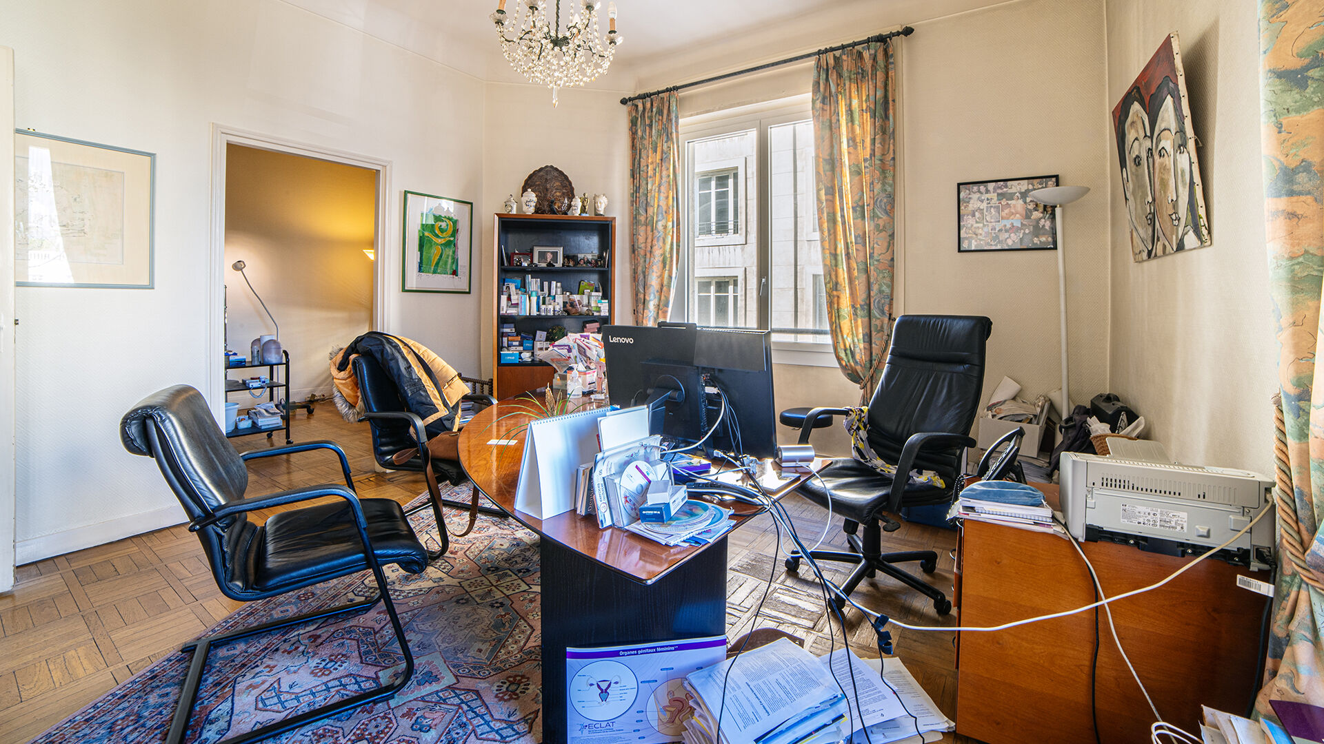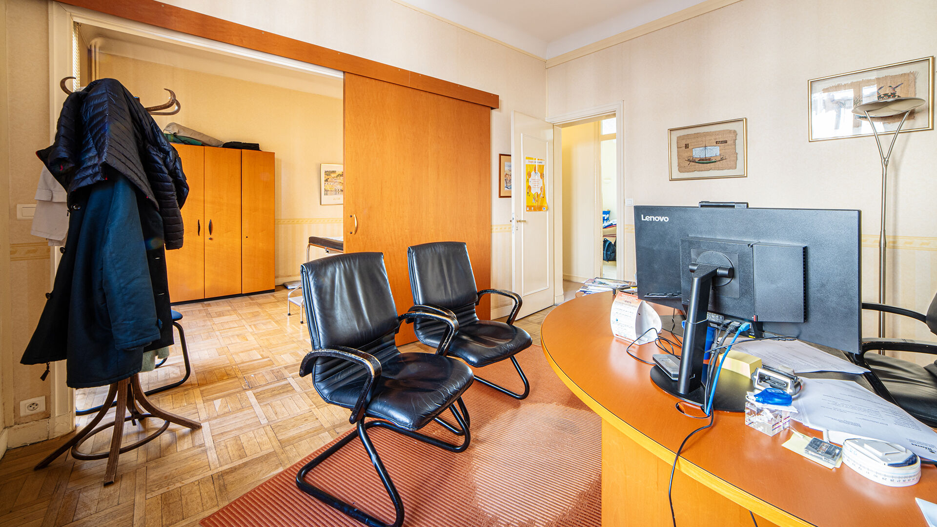 Entrée, 3 double bureaux, 1 bureau simple, cuisine, local archive et WC.