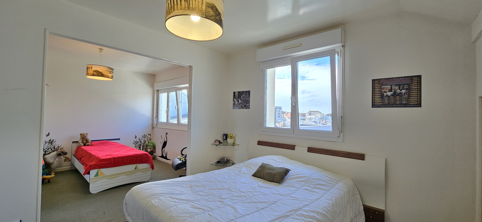 À l'étage, vous trouverez deux chambres, dont l'une disposant d'une vue sur le port et pouvant être facilement divisée en deux pièces distinctes, permettant ainsi d'obtenir une chambre supplémentaire. Une salle de bains, un WC séparé et une pièce aménagée en bureau viennent compléter cet étage.