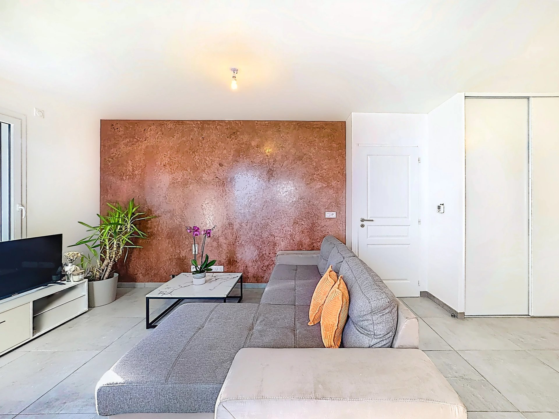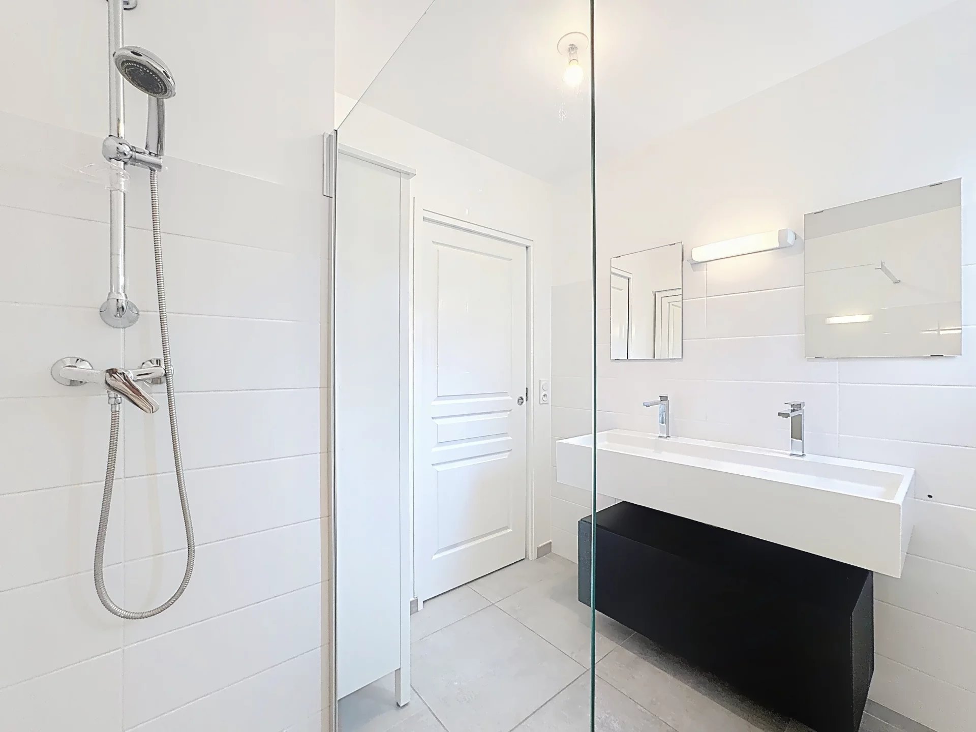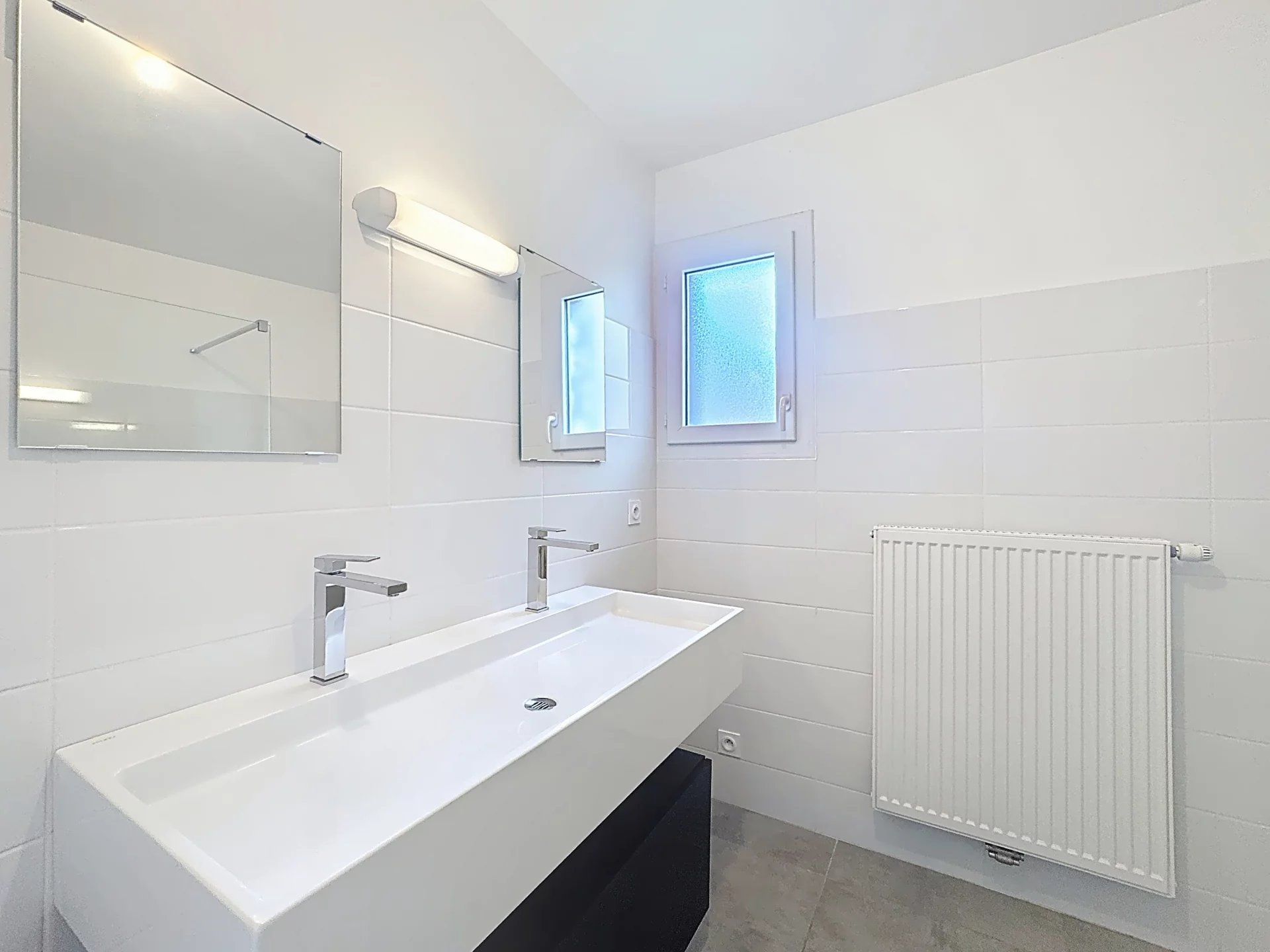 L’espace nuit, séparé, comprend une grande chambre avec dressing mural, une salle de douche équipée d’un meuble avec double vasques et une fenêtre, ainsi que des toilettes séparées, pour un confort optimal.