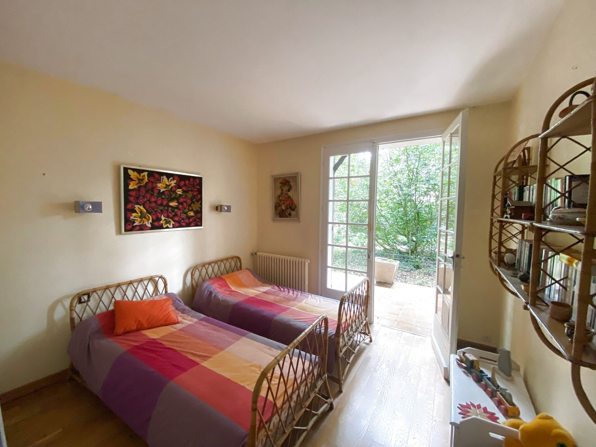 À l'étage, deux chambres avec vue sur la nature viennent compléter l'ensemble, accompagnées de nombreux rangements, d'une mezzanine chaleureuse, d'une pièce polyvalente pouvant servir de bureau ou salle de jeux, ainsi que d'une seconde salle de bains et de toilettes indépendants.