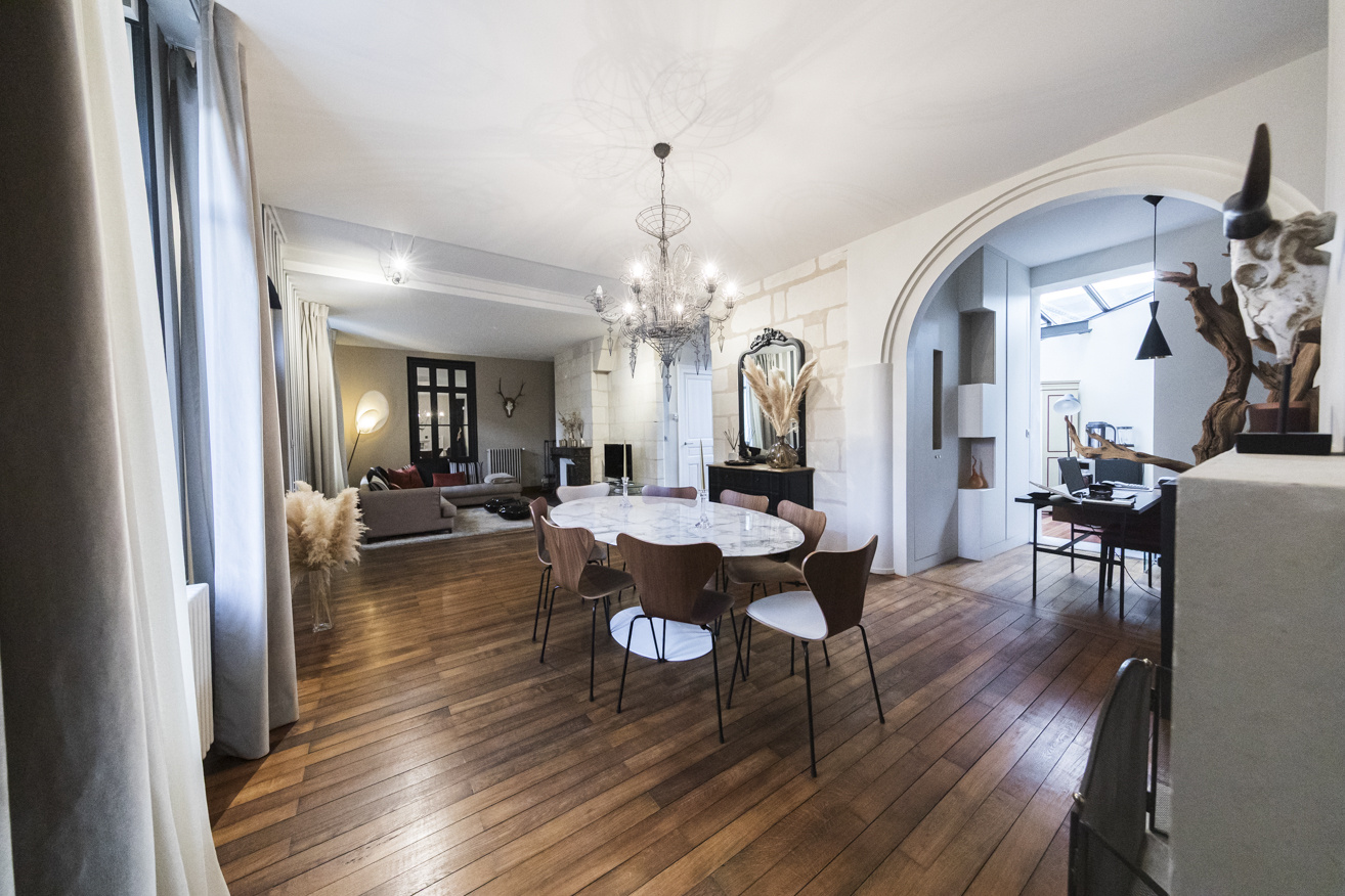 Au rez-de-chaussée, un double séjour avec parquet en chêne, cheminées et murs en pierres de tuffeau, un espace bureau aménagé, une cuisine aménagée et équipée très lumineuse et ouverte sur l'espace jardin, un cellier/buanderie, une autre grande pièce de vie ouverte sur le jardin et une pièce consacrée à l'espace détente avec un SPA JACCUZI, WC séparés. Au dessus de cette pièce, vous disposerez d'une grande chambre avec salle d'eau privative.