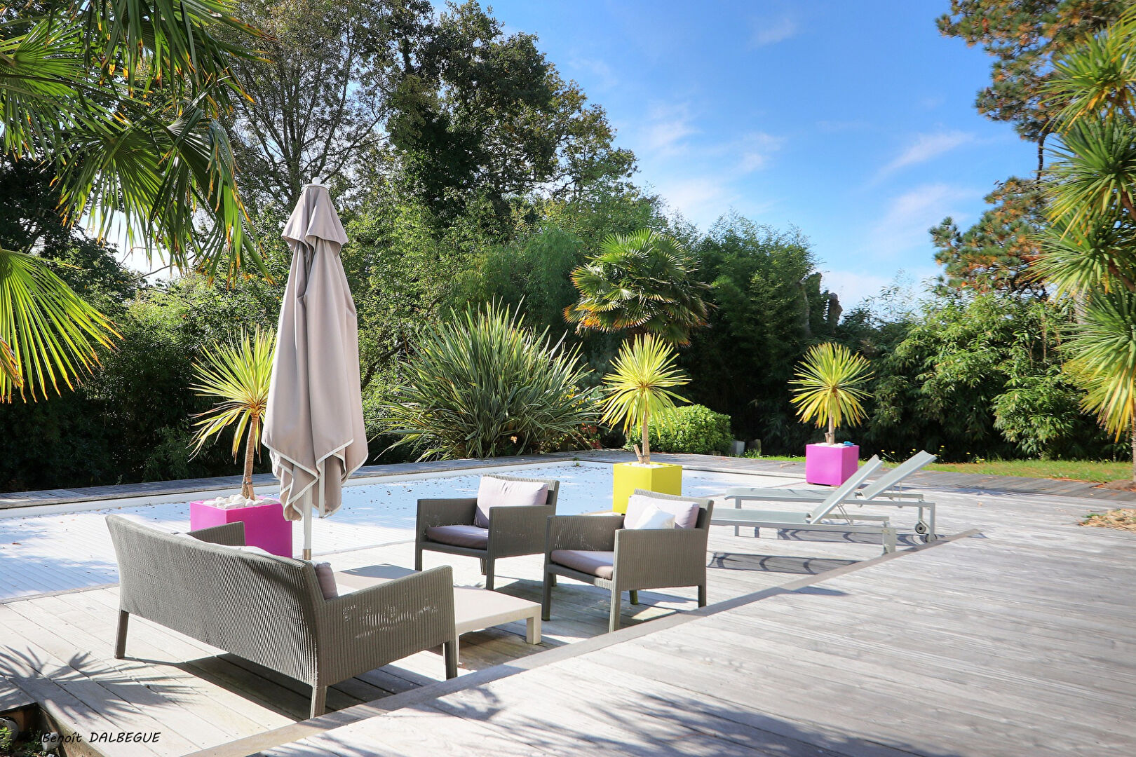 L'extérieur de la propriété est tout aussi séduisant avec une grande terrasse en bois exotique, une piscine équipée d'un liner, et un jardin paysagé entièrement clos, garantissant une intimité totale. De plus, la propriété offre la possibilité de stationner un bateau sur place.