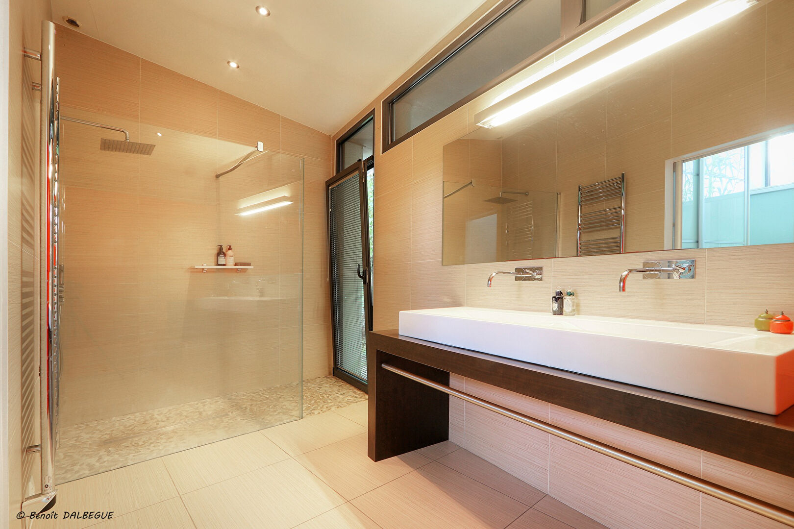 Dès votre arrivée, vous serez accueilli par une vaste cour, offrant de nombreuses places de stationnement ainsi qu'un double garage. Une allée paysagée vous conduit à l'entrée principale, qui s'ouvre sur un immense salon séjour de plus de 120 m², baigné de lumière grâce à son exposition plein sud et ses différentes hauteurs sous plafond. Cet espace de vie impressionnant donne un accès direct à la terrasse. Le salon, équipé d'un système son et lumière immersif, dispose également d'une cheminée moderne et d'un puits de lumière.