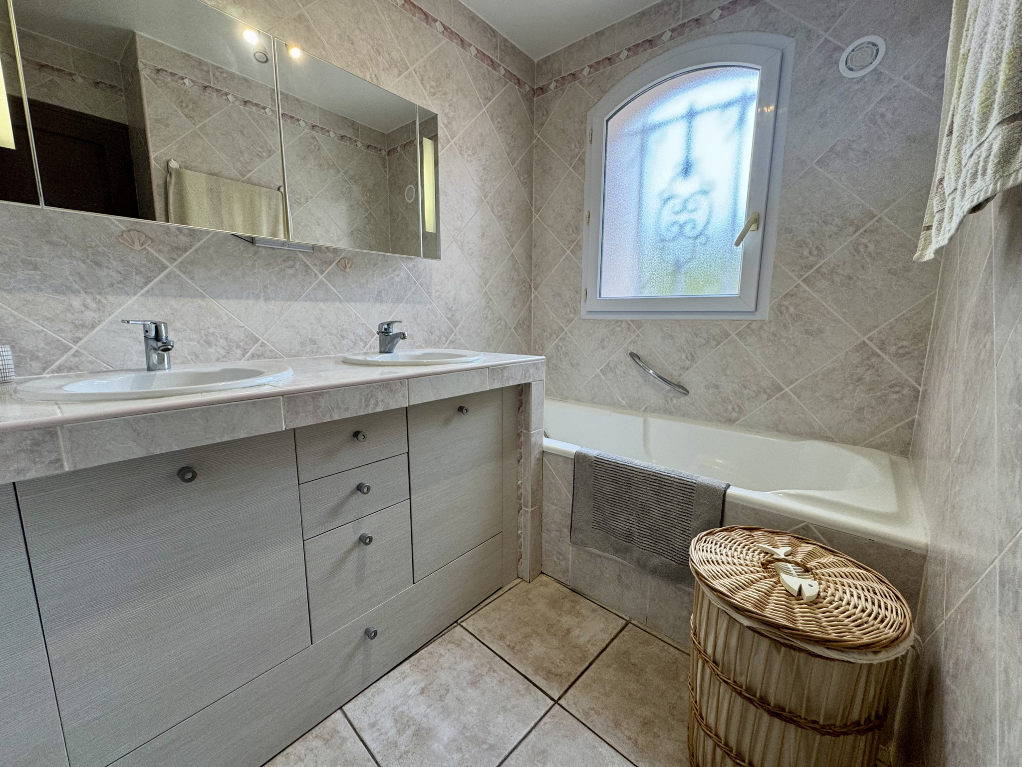 Agréable villa rénovée, proche de la mer, en fond d'impasse dans un secteur calme. Exposée Sud et d'une surface d'environ 180m2 elle se compose comme suit : entrée avec vestiaires et toilettes invités, cuisine donnant sur une grande vérandé, séjour salle à manger avec insert. Espace nuit comprenant trois chambres en suite. Appartement en duplex type 2 pièces d'environ 50m2 et indépendant. Un sous sol total, garage double. Terrain plat et paysagé d'environ 1000m2, piscine traditionnelle à débordement et au chlore. Double vitrage, climatisation réversible. Située à 300m du centre ville et 600m de la plage.