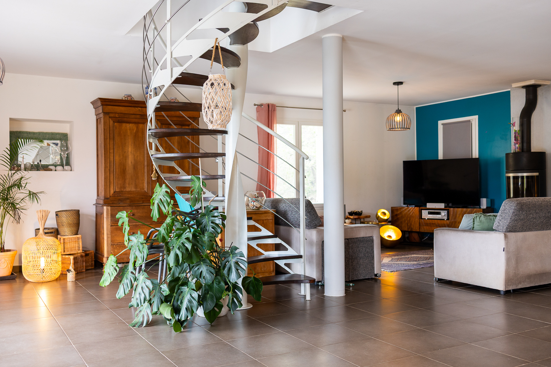 Principalement exposée SUD, elle se compose au rez de chaussée : d'une cuisine aménagée et équipée, avec cellier attenant, ouverte sur un vaste salon/séjour d'environ 65m2 avec baies à galandages faisant face à la pisicne. Le pôle nuit se compose d' un bureau avec mezzanine, 3 chambres d'environ 12.5m2 avec porte fenêtre sur le jardin côté piscine, un grand dressing d'environ 11m2, une SDB avec triple vasque et WC, une sde et un wc..