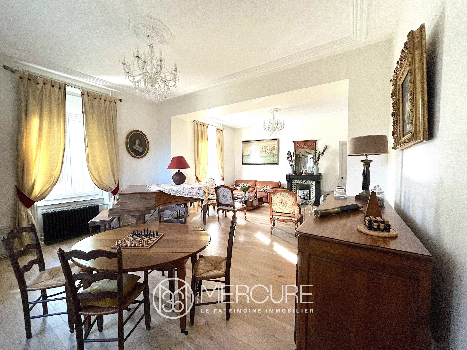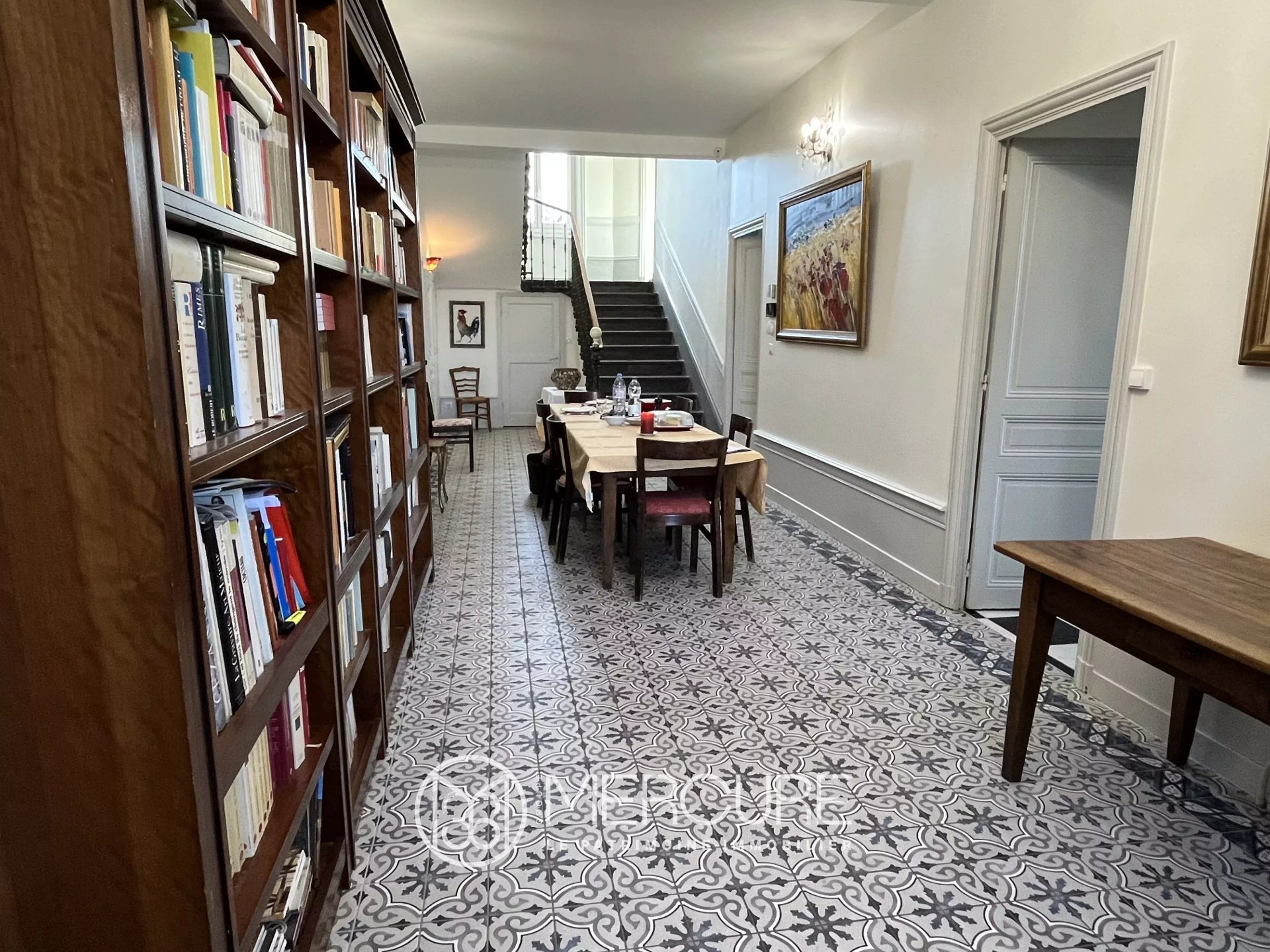 Le rez de chaussée de la maison s’ouvre sur un vaste hall d’entrée magnifiquement rénové qui dessert un salon-séjour double lumineux, un bureau, une chambre de plain-pied, la cuisine et une salle d’eau avec toilettes.