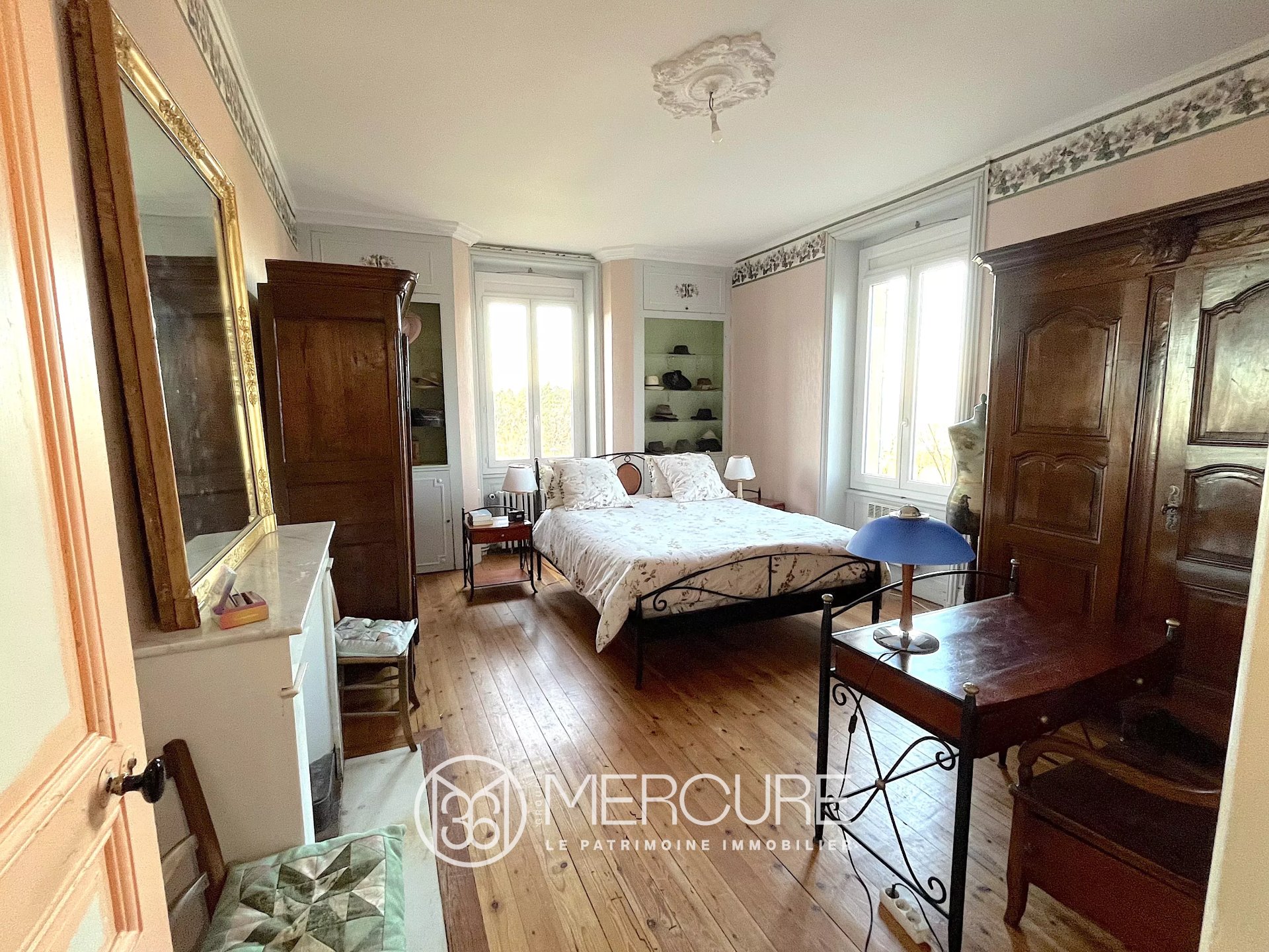 Un bel escalier en pierre conduit au 1er étage où un grand palier avec rangements distribue quatre chambres aux surfaces généreuses et une salle de bain avec toilettes à rafraîchir.