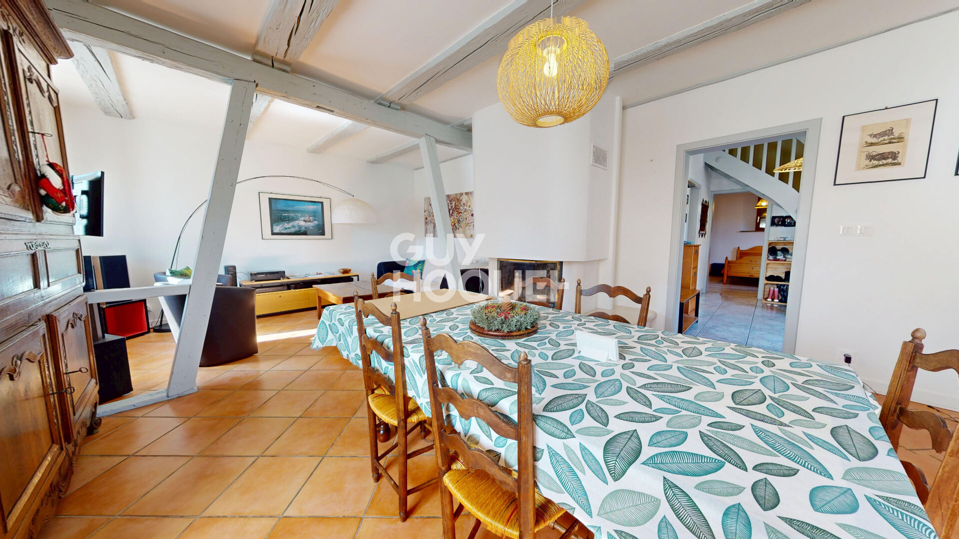 Pièce de vie traversante avec cheminée, très lumineuse
