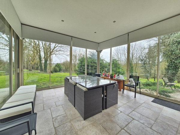 La véranda, baignée de lumière grâce à ses larges baies vitrées orientées plein sud, vous offrira une vue imprenable à 180o sur la nature environnante. À l'étage, un palier distribue deux chambres supplémentaires ainsi qu'un grenier. Un garage attenant complète l'ensemble.