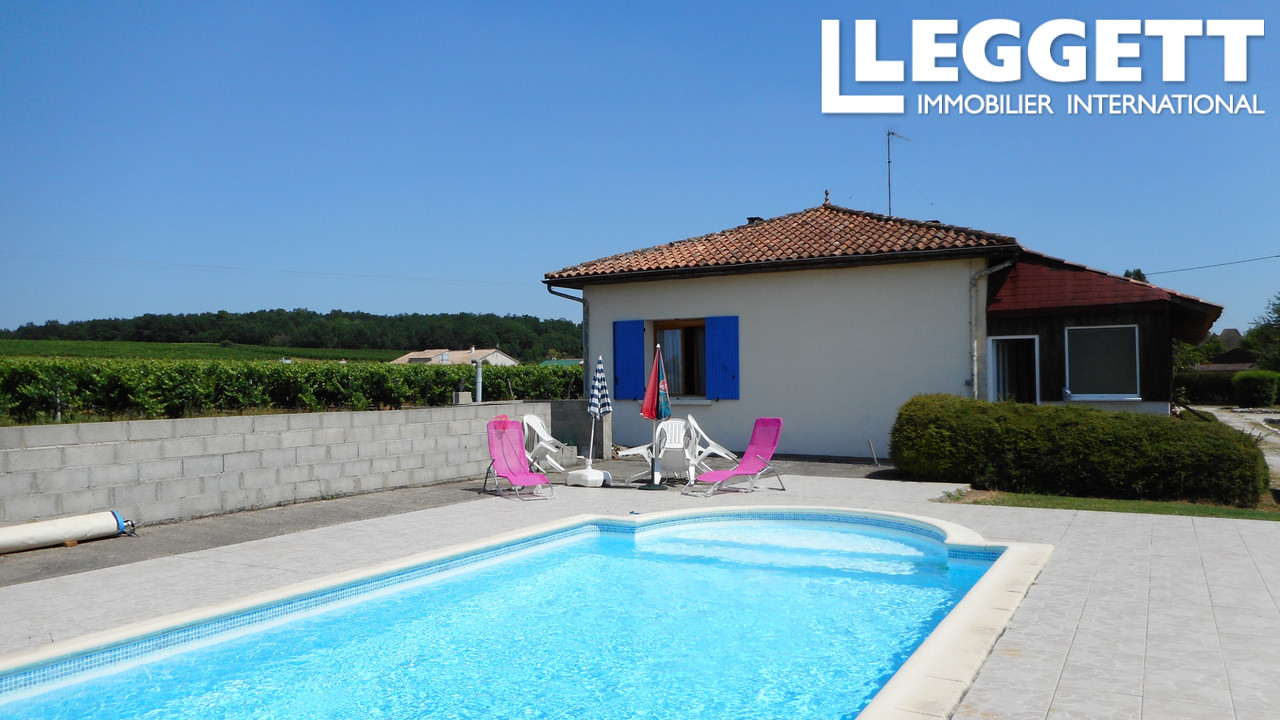 A35726GJP24 - Une propriété de village avec un grand jardin, une piscine, un garage et une maison confortable plain pied. Vue sur les vignobles à l'arrière et accès facile à Eymet (15km), Sigoules (11km) et St Foy La Grande (11km), avec Bergerac et son aéroport à seulement 25 minutes en voiture. Le prestigieux golf des Vigiers est également à 3 km.