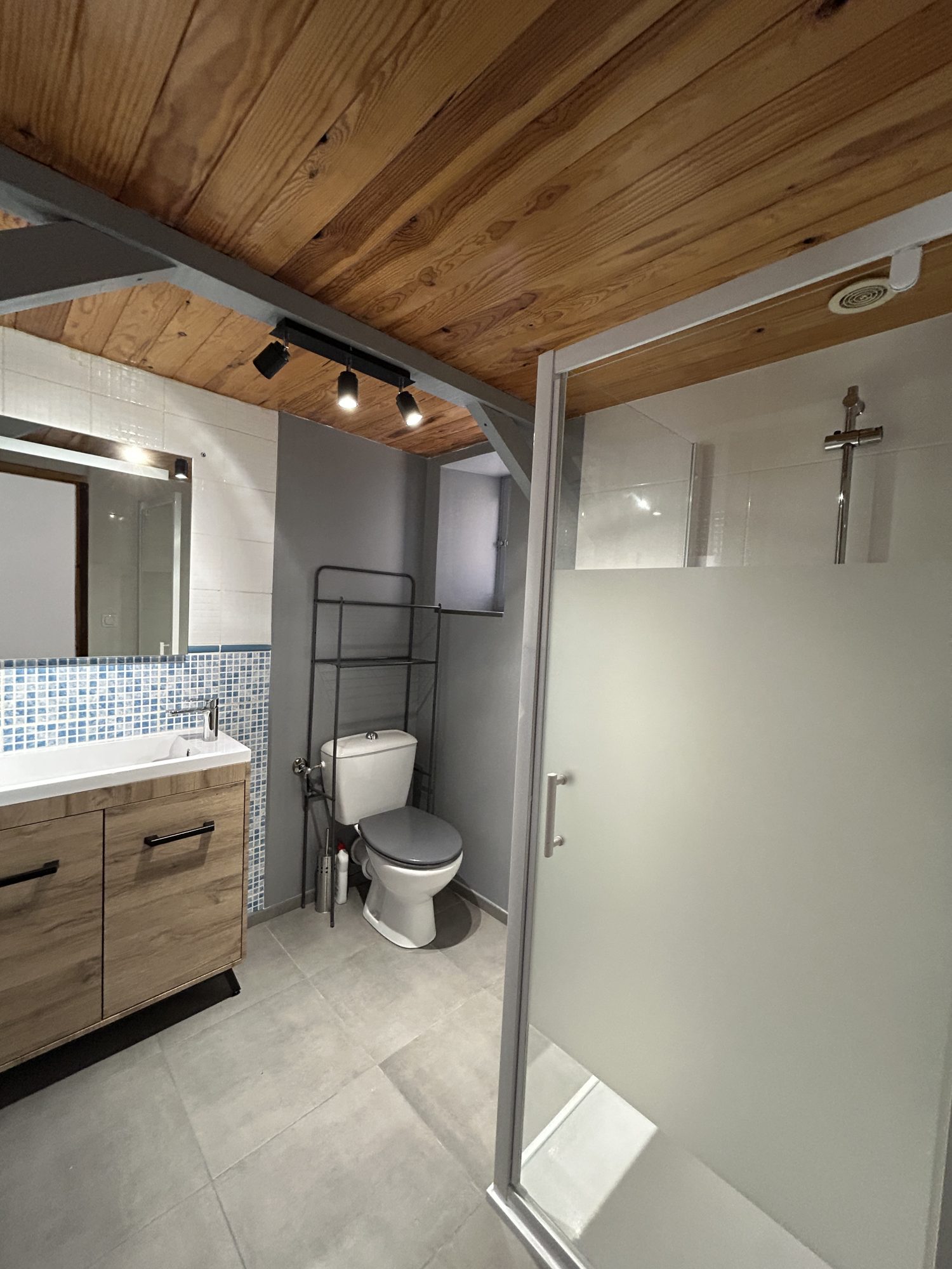 Premier étage : une cuisine ouverte sur le séjour, un salon, et une salle d'eau avec WC.