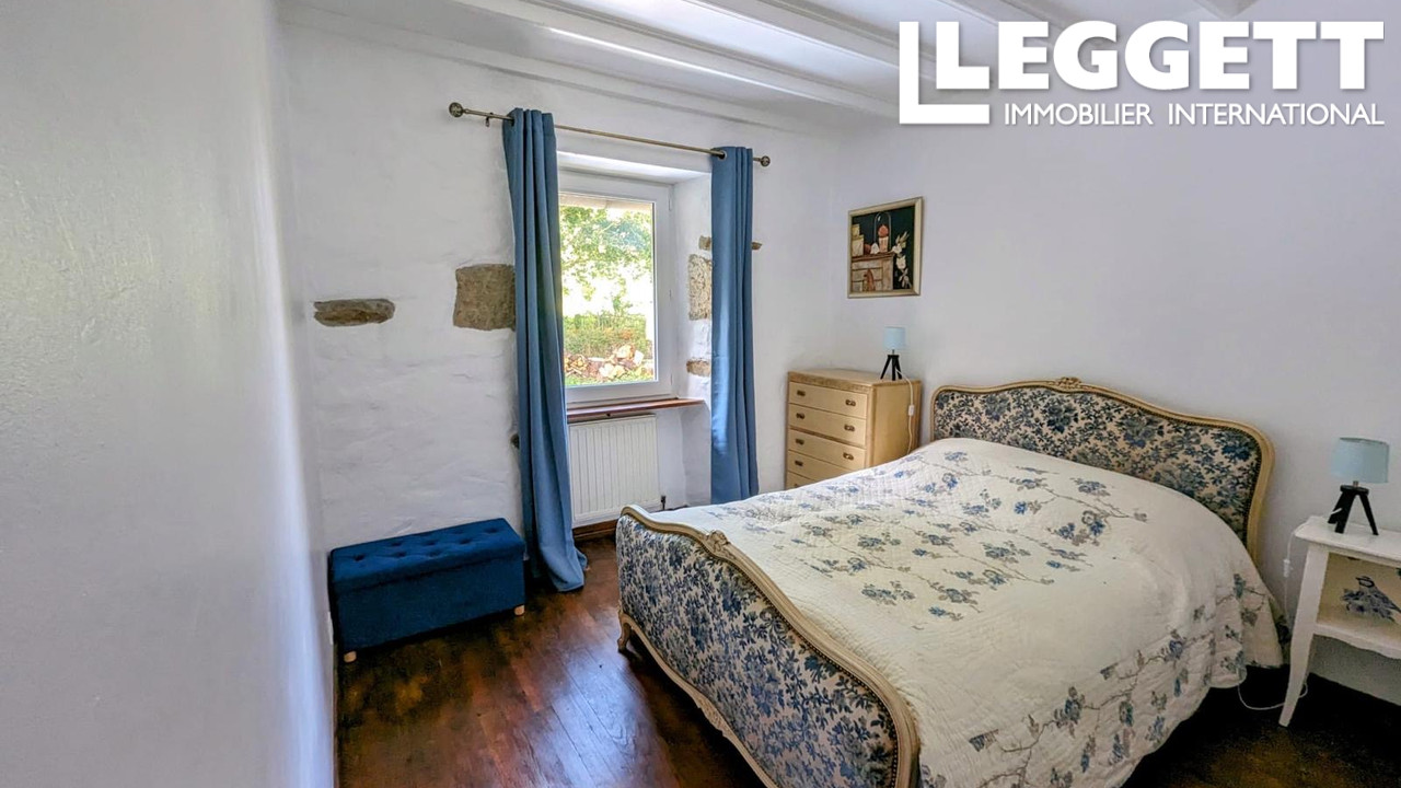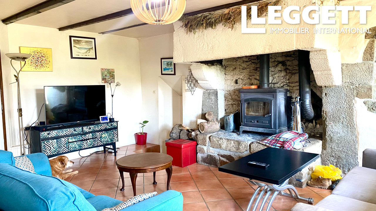 A35583CO50 - Une grande longère divisée en quatre parties : une maison principale avec 4 chambres dont 3 équipées de salle de bain, une partie gîte de 2 chambres, un studio et un bungalow à rénover. 5 hectares de terrain, sur le derrière et le côté de la maison, légèrement vallonné avec accès à la rivière. 2 dépendances extérieures.