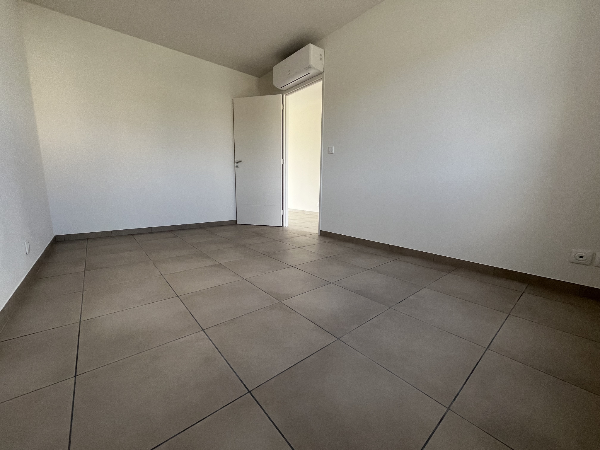 Pièce de vie lumineuse avec climatisation, ouverte sur une cuisine équipée avec plan de travail en chêne massif.