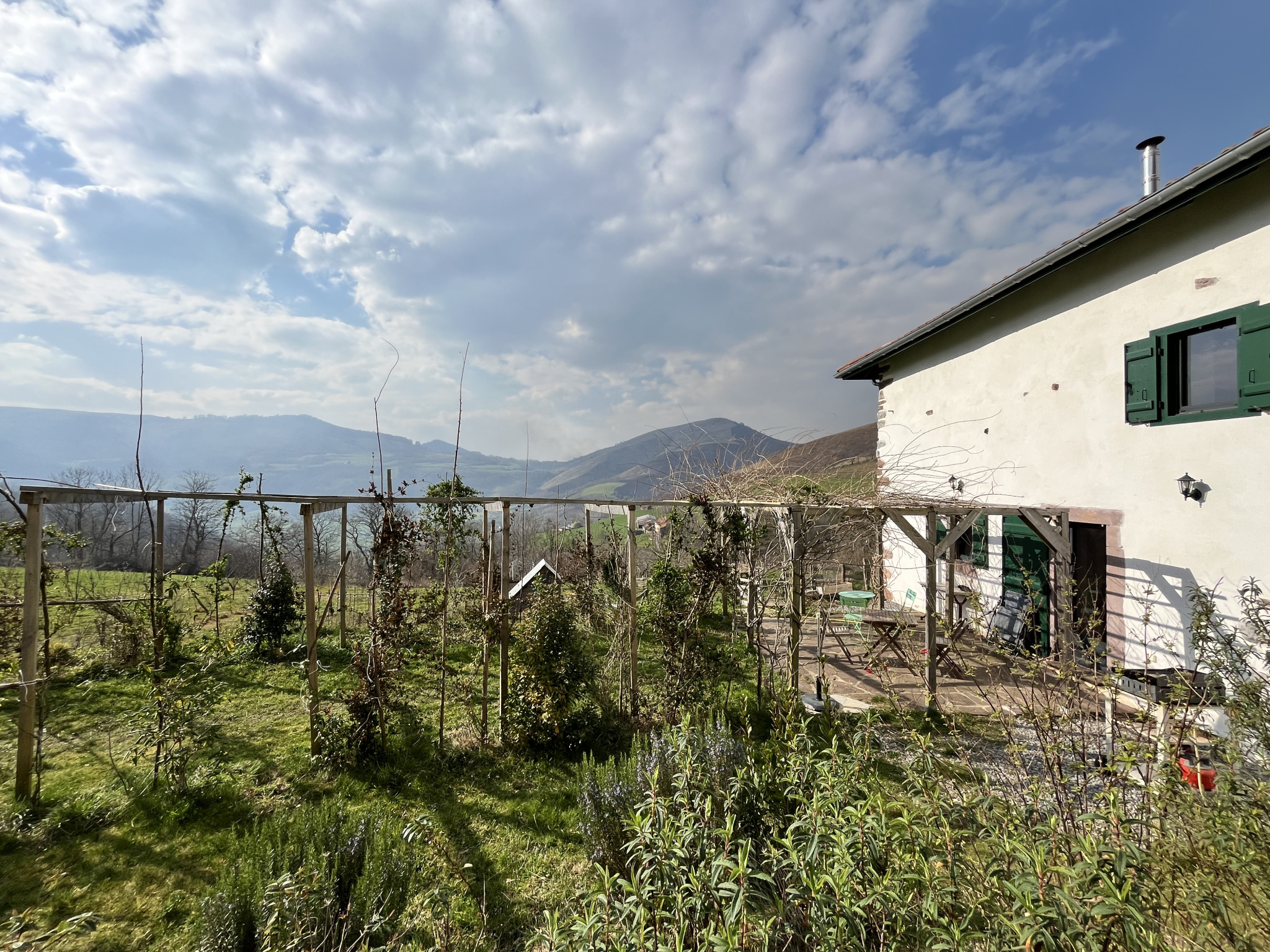 Maison navarraise traditionnelle en Pays basque intérieur dans un cirque au calme sur un flanc de montagne à 400 m d'altitude, vue exceptionnelle. Village à 1km. Ferme arboricole (certifiée AB) entourée de 1 ha de verger en production de fruits et petits fruits, 1 ha de prairies, 15 ha de forêt attenante et 1ha de landes en estive. La maison d'habitation (160 m2 habitables) rénovée en 2019 de façon écologique : isolation chaux chanvre pour les murs, laine de bois pour le toit, sols en terre cuite sur dalle chaux-liège au rdc et plancher bois non-traité aux étages, comprend 3 niveaux : o RDC, séjour, cuisine ouverte, cellier, salle à manger o 1er étage : 3 chambres, grand palier bibliothèque, grande salle de bain et toilettes sèches o 2e étage, grand espace loft qui sert actuellement de bureau, de salle de jeu et de gymnastique. Chauffage central au bois avec une cuisinière bouilleur, chauffe également l'eau, un poêle à bois dans la cheminée installé en 2023 (consommation totale annuelle de ± 10 stères de bois suivant les hivers). Traitement des eaux par phytoépuration. La maison comprend également sur deux niveaux dans sa partie Est : Au RDC : atelier de 70 m2 pour ranger les outils et bricoler. À l'étage : atelier de transformation végétale opérationnel de 70 m2, rénové en 2024, isolé en chaux-chanvre-terre pour les murs et laine de bois sous le toit. Comprend une cuisine pro, zones de stockage, de rangements et de travail, toilettes sèches et salle-de-bain sur mezzanine. Cet ensemble peut convenir à : Toute famille désireuse de nature, de tranquillité et de beauté dans un site préservé écologiquement, à un quart d'heure en voiture de commerces et professionnels de santé.