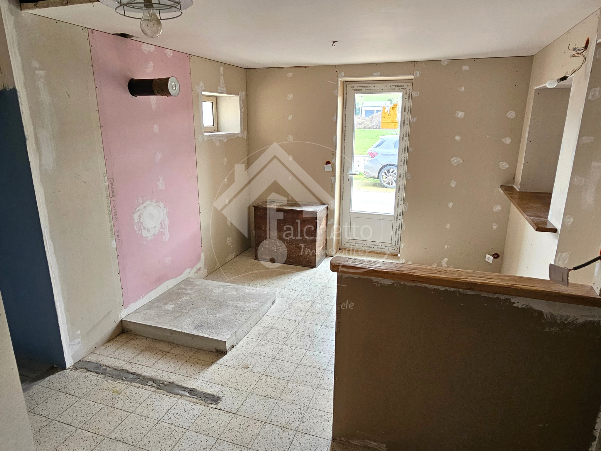 Les fenêtres double vitrage et portes sont neuves. Les murs ont été isolés (joint de placo et plafond à finir), l'électricité et la plomberie sont à terminer.