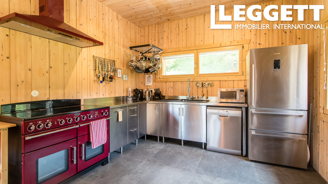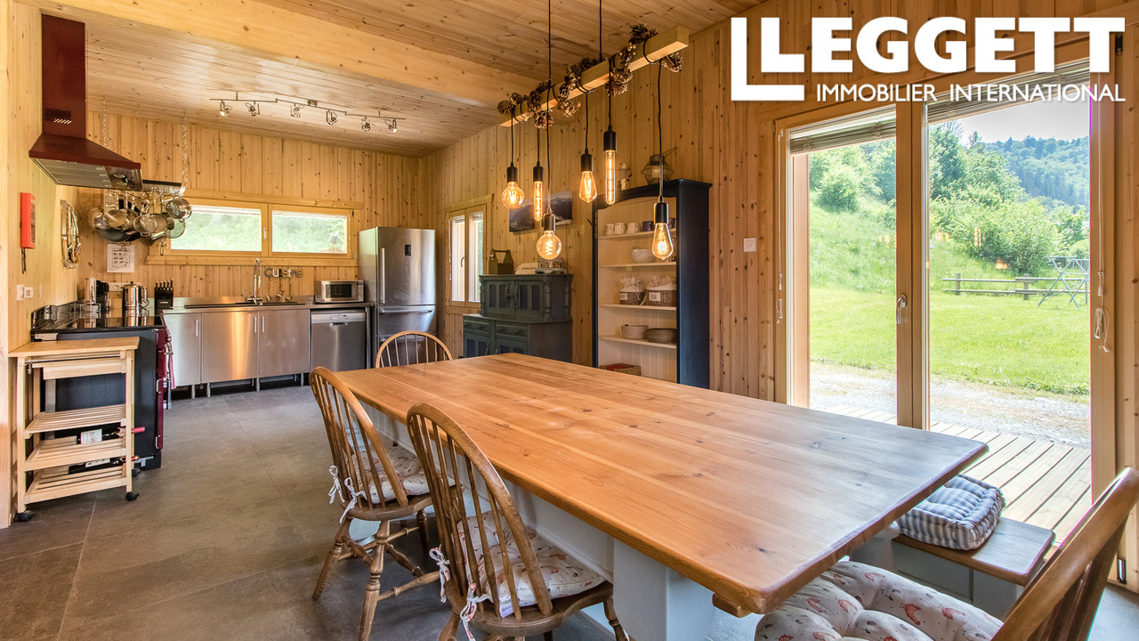 À l'avant, un grand jardin donne sur des champs ouverts, tandis qu'à l'arrière, le chalet est adossé à la forêt.