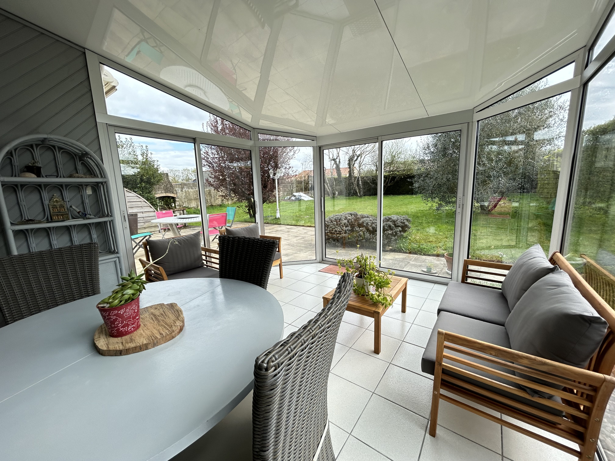 Au rez-de-jardin: grand salon/séjour avec poêle (30,41m2) lumineux, véranda de 15,38m2 ouverte sur la terrasse et le jardin, plein Sud! Cuisine spacieuse, aménagée et équipée avec vue jardin, WC, 2 chambres ( 11,74m2 et 11, 60m2) , WC