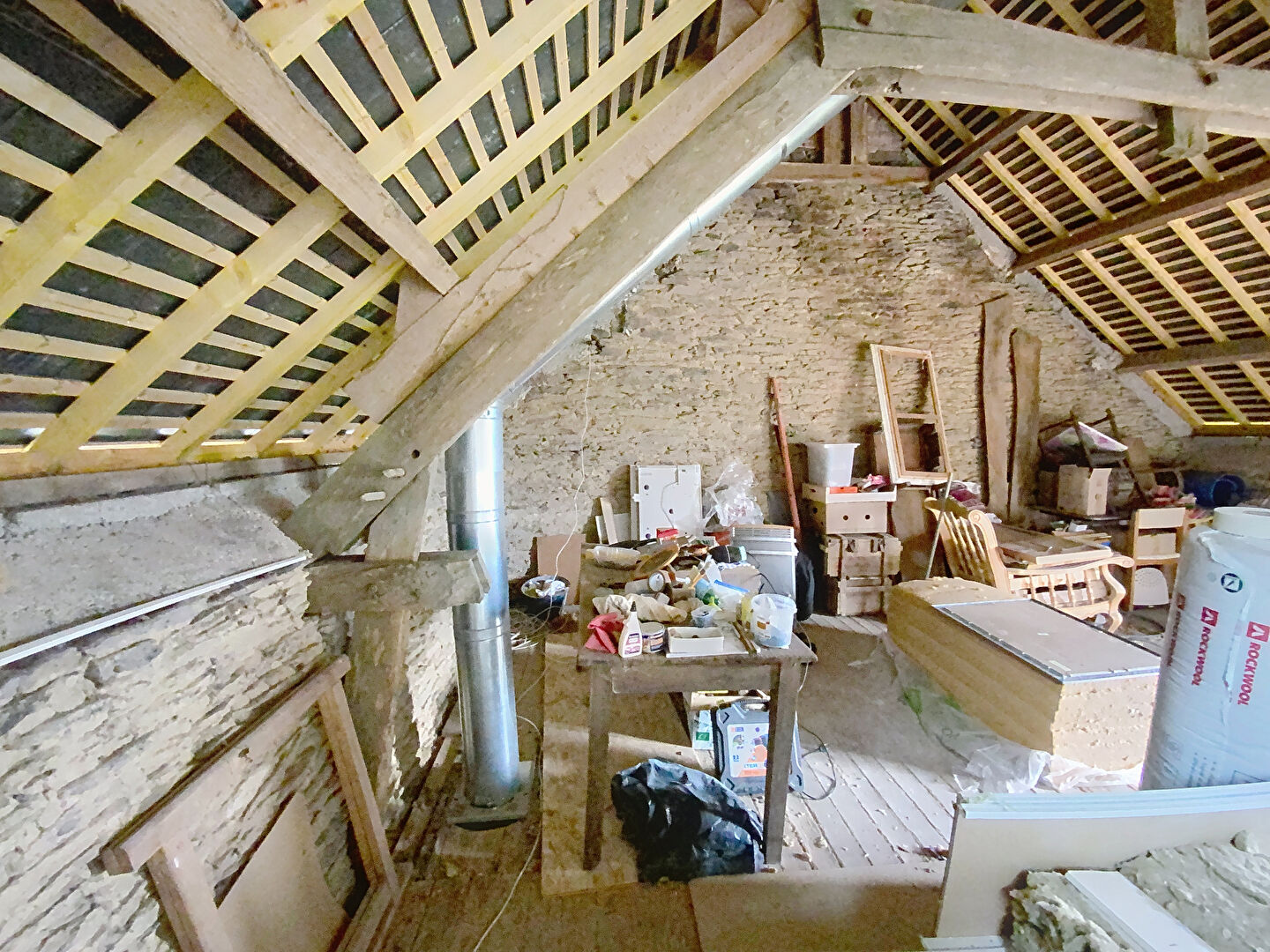 A l'étage : une chambre (15 M2) et une salle d'eau à terminer. Beau potentiel pour ce grenier d'environ 40 m2 supplémentaire. . Fenêtres doubles vitrages en bois, toiture neuve,