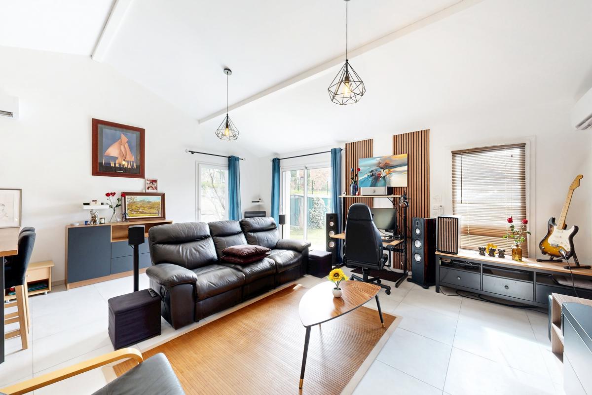 Édifiée sur un terrain arboré de 600 m², cette maison lumineuse s'ouvre sur une belle entrée desservant une vaste pièce de vie traversante salon-salle à manger, prolongée de deux terrasses idéales pour vos soirées d'été ou moments de détente.